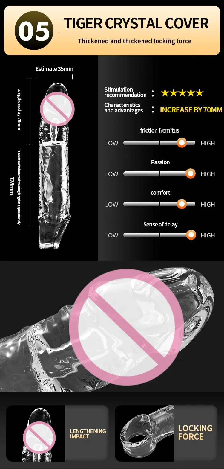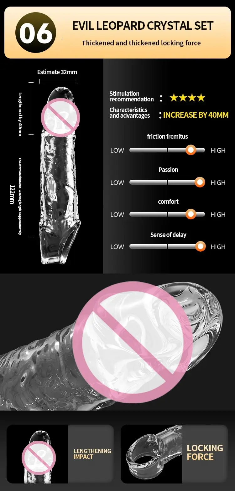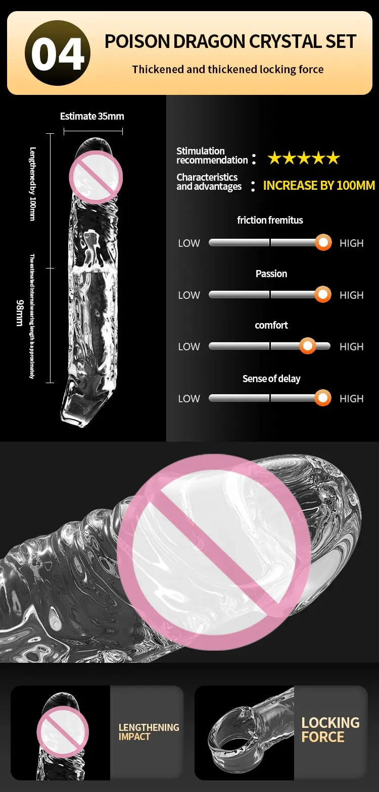 JIUUY Transparent Penis Extend Sleeve Reusable Condoms Dildo Enhancer Delay Ejaculation Cock Rings Nozzle Sex Toys for Men