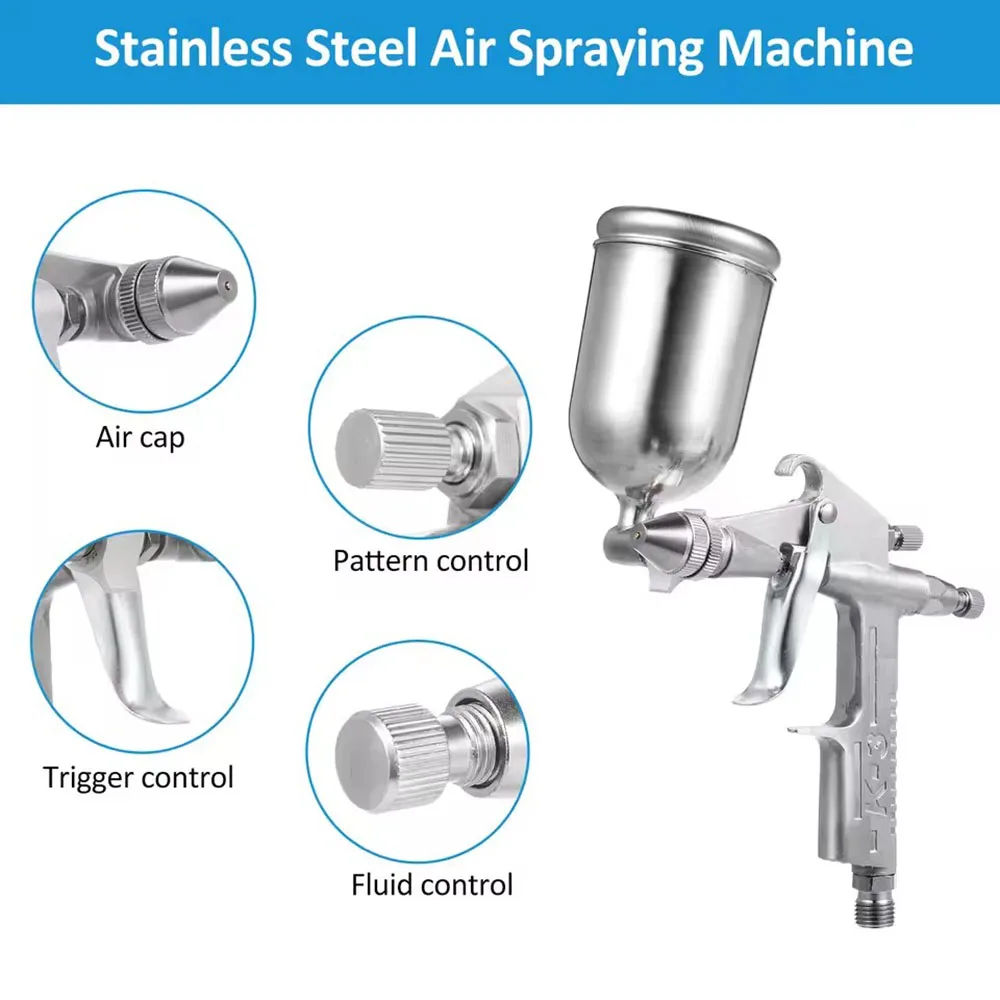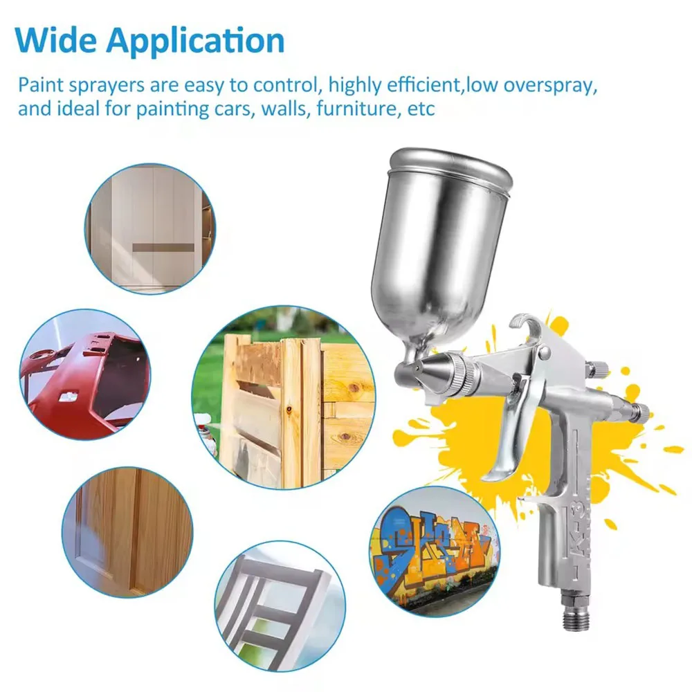· High atomization paint effect, round spray pattern, copper nozzle, stainless steel thimble, chromium plating on gas cap surface, alloy gun body, surface polishing treatmentFeatures:- Hand-held, easy to operate.- Lightweight aluminium material, easy to operate