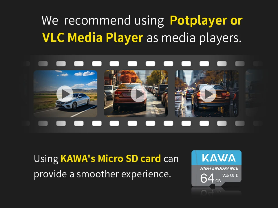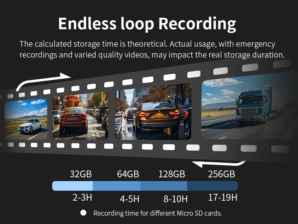 When your Micro SD card (not included) is full, the 4K dash cam will overwrite the oldest footage to achieve continuous recording. The emergency-recorded videos are stored in a separate folder and won't be overwritten by regular videos. You can change the recording video duration(options of 1, 2, 3 minutes).