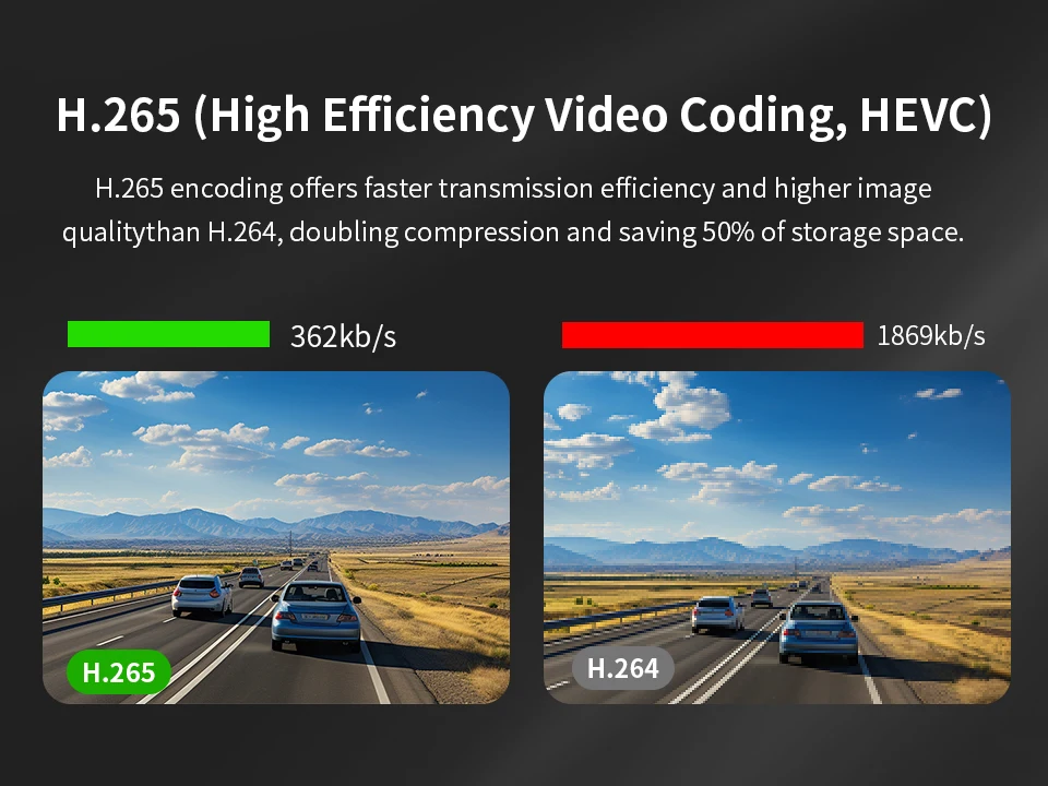 H.265 encoding offers faster transmission efficiency and higher image quality than H.264, doubling compression and saving 50% of storage space.(Please ensure that your player supports the H.265 video format).