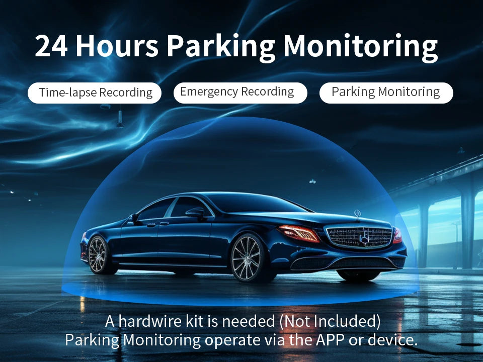 The built-in G-sensor detects sudden impacts or collisions when your car is parked, initiating recording to provide crucial 24-hour evidence. Receive notifications and access event footage through the KAWA AUTO app. Parking mode requires a separate mini USB hardwire kit (not included).