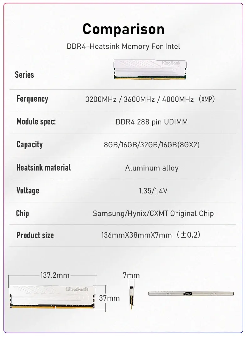 Kingbank Heatsink Ram Memory DDR4 8GB 16GB: This product is a top-of-the-line RAM with a heat sink, offering excellent performance and reliability. It is available in 8GB, 16GB, and 32GB capacities, and supports DDR4 3200, 3600, and 4000 MHz frequencies.