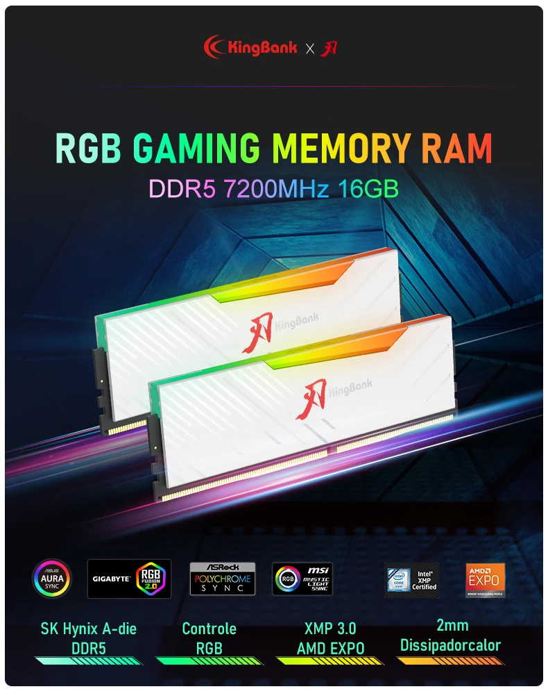 KingBank SharpBlade DDR5 RGB gaming memory can run up to 7200MT/s. Each 288-pin DIMM is equipped with PMIC
