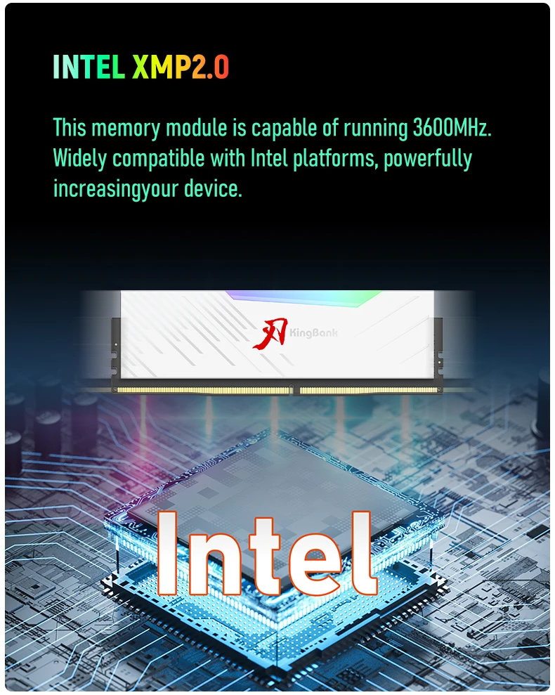 KingBank SharpBlade DDR4 RGB gaming memory modules support Intel CPU. Each 288-pin DIMM is with gold contact fingers neatly lined in the multi-layer PCB board and armored with a metal heatsink. Working generally at a voltage of 1.35V, the transmission bandwidth goes up to 25.6GB/s. Featuring effective heat dissipation, stable high-speed performance, the memory modulesalso support synced lighting with motherboards such as ASUS, MSI, and GIGABYTE.