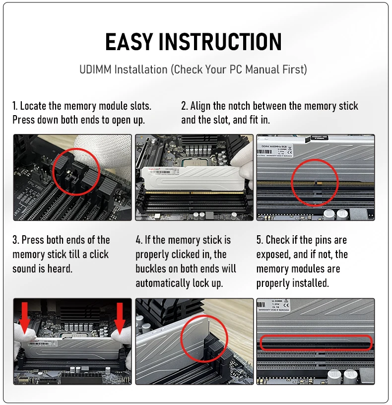 Installation: For memory modules larger than 4GB, please install them on a 64-bit operating system. For computers with fast booting function, it is normal to reboot it with failure right after installation. Try to switch slots to install the memory sticks and reboot your computer for 1~2 more times.