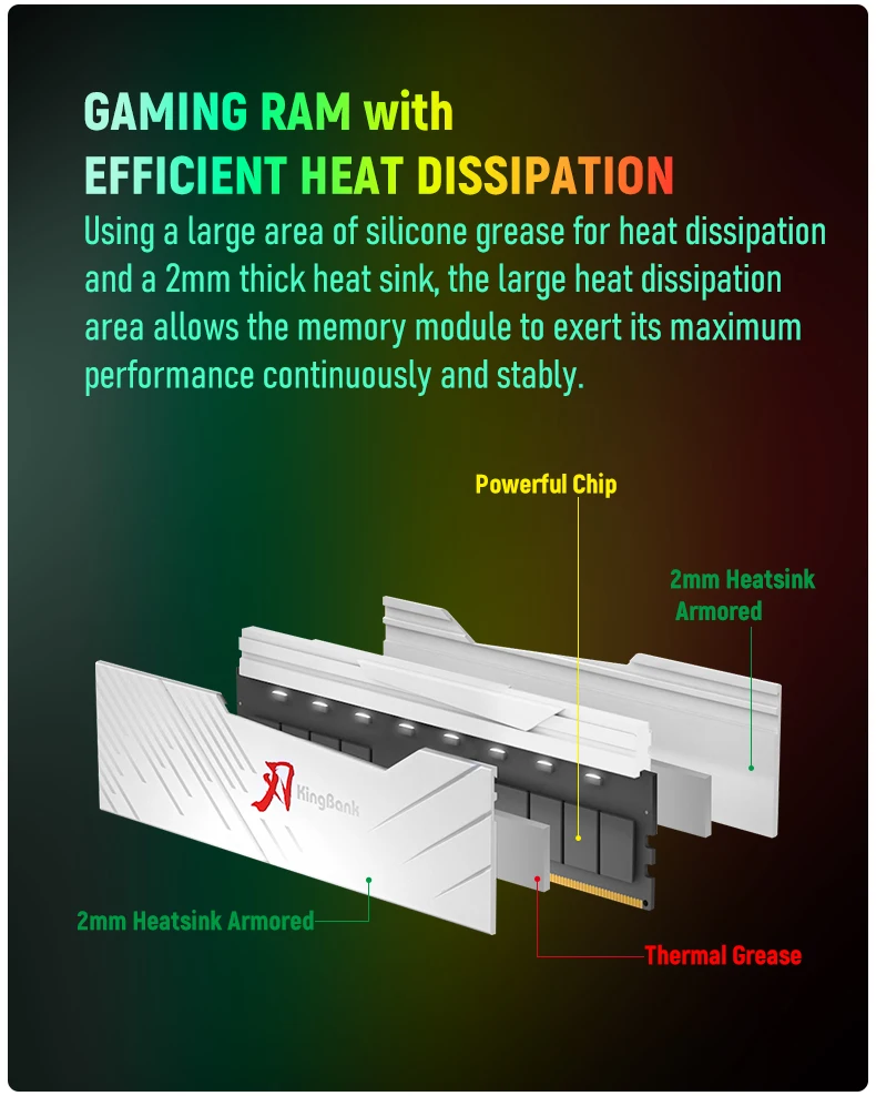 • High-Performance DDR4 Memory :Experience rapid data processing with Kingbank's RGB Memory Module, a high-performance DDR4 solution that ensures smooth and efficient operation for your desktop computer.