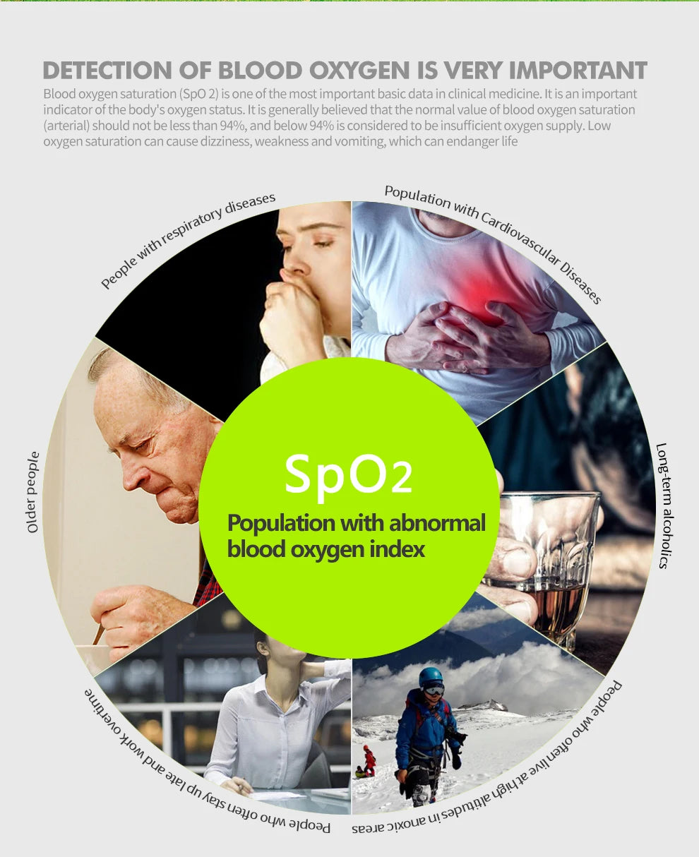 Blood oxygen saturation(SpO2) is one of the most important basic data in clinical medicine.It is an important indicator of the body's oxygen status.It is generally believed that the normal value of blood oxygen saturation (arterial) should not be less than 94%,and below 94% is considered to be insufficient oxygen supply.Low oxygen saturation can cause diziness,weakness and vomiting,which can endanger life.