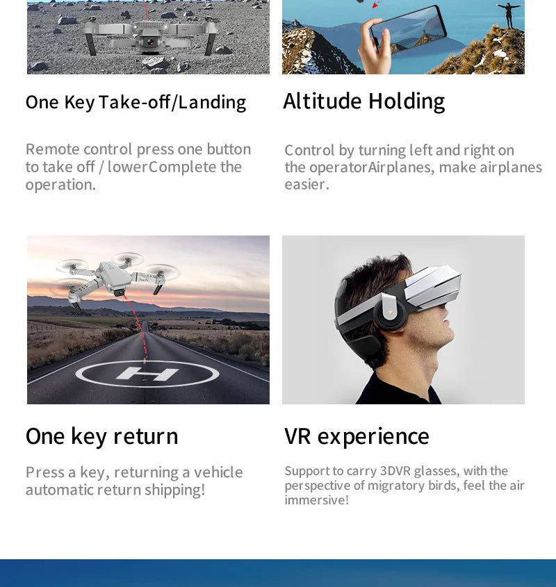 Up/down, Forward/backward, Turn left/right, Sideward flight, 3-level flight speed, LED Light, Headless Mode, One Key Automatic Return, Altitude Hold Mode, WiFi FPV, Trajectory Flight, Camera/Video