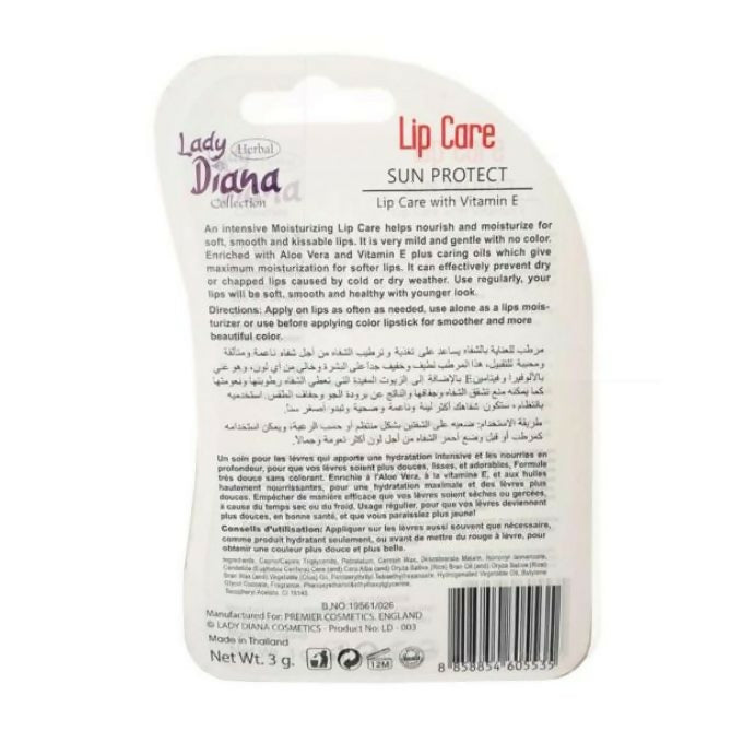 - Lady Diana Sun Protect Lip Care Balm offers essential sun protection and hydration in a compact 3g tube.