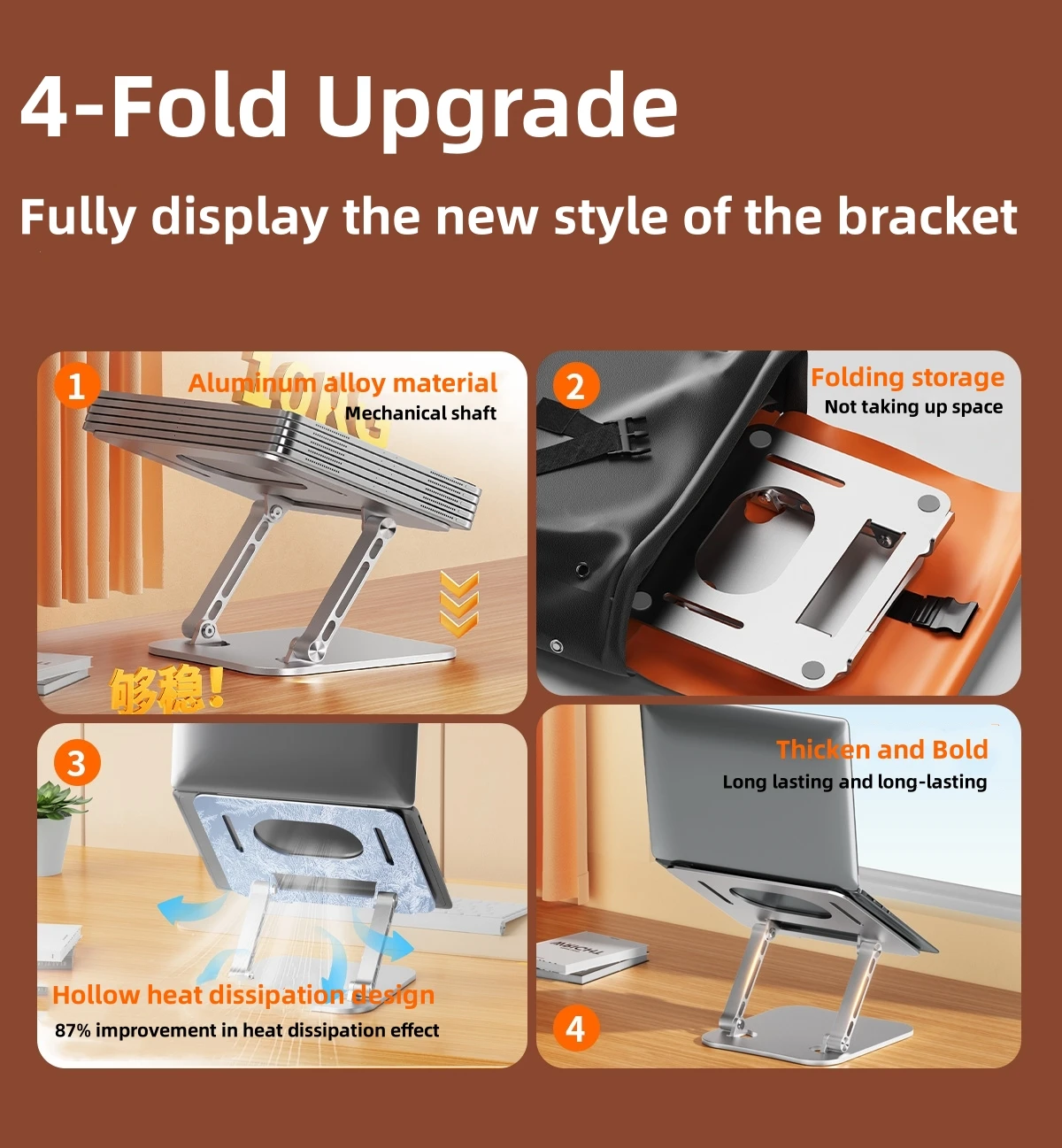• Durable Aluminum Alloy Material :Crafted from robust aluminum alloy, this laptop stand ensures long-lasting durability and stability, providing a sturdy platform for your device.