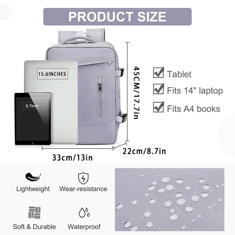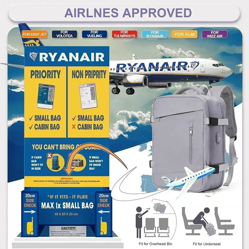 【Boarding Bag, Cabin Bag】 Small size: 40 * 20 * 25CM, flight allowed by Ryanair. This size is within the maximum takeoff limit of most aircraft.