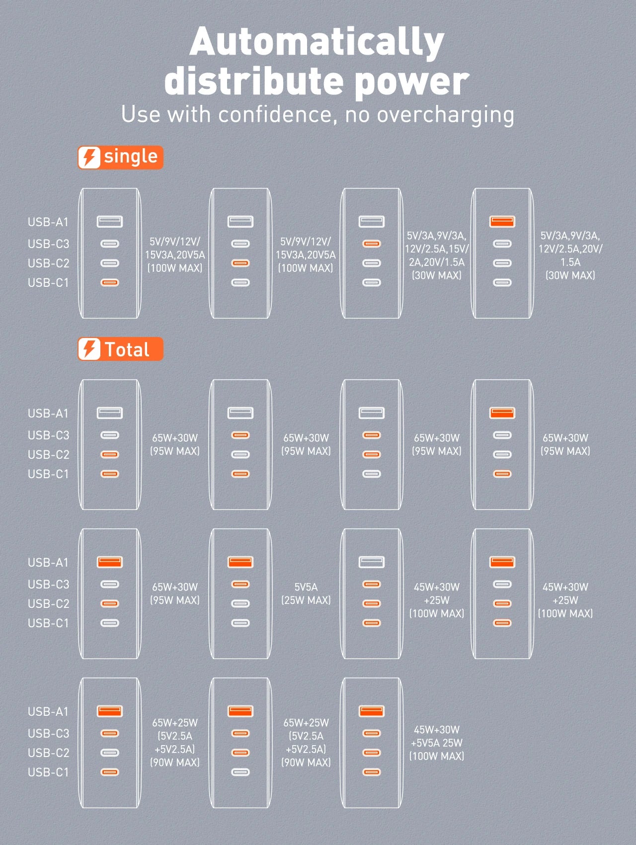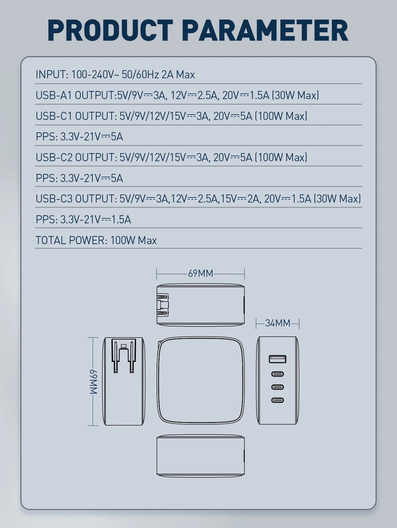 USB-C1 OUTPUT: 5V/9V/12V/15V⎓3A, 20V⎓5A (100W Max) PPS: 3.3V-21V⎓5A