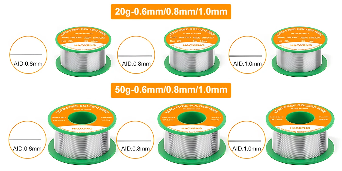 Specifications of lead-free solder wire:1.20g has 0.6mm/0.8mm/1.0mm,2.50g is available in 0.6mm/0.8mm/1.0mm