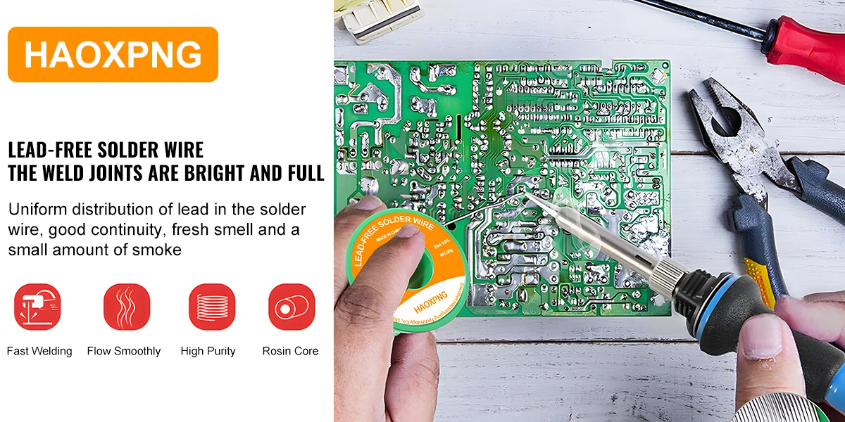 Lead-free solder wire solder joints are bright and full, uniform distribution of lead in the solder wire, good continuity,It is commonly used for soldering electronic component circuit boards, suitable for LEDs, household appliances, electronic components, and other soldering work.