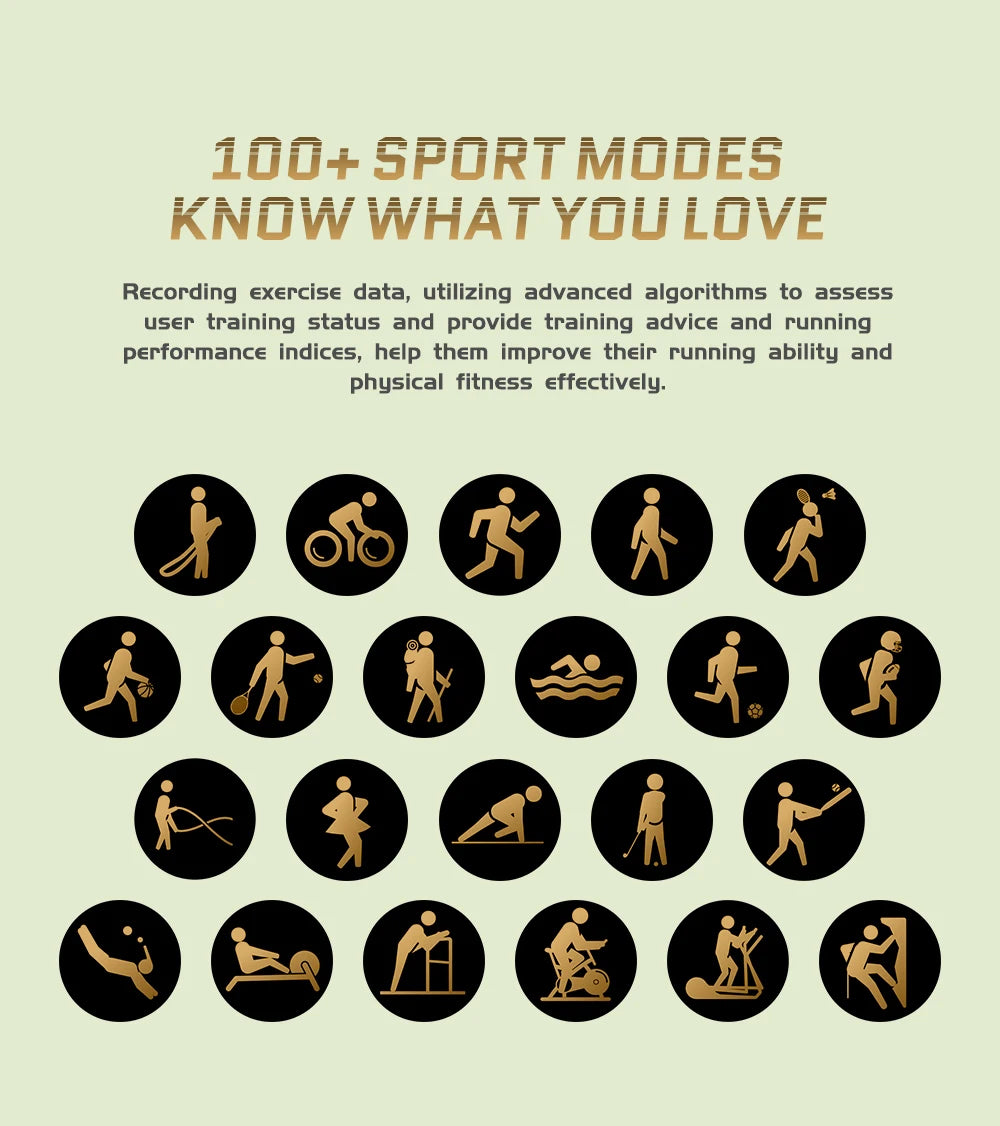 Basic function: Activity center (step counting, calories), sleep detection, heart rate detection, exercise modes (100+ types), exercise records, blood pressure detection, blood oxygen detection, stress detection, weather information, Bluetooth calls, message, remote control photography, music control, Stress reduction and sleep aid, voice assistant, timer, alarm clock, stopwatch, menstrual period, phone search, calculator, do not disturb mode, power saving mode, raise to wake, brightness adjustment, sound mode, vibration adjustment, watch face switching, menu style switching, sports goal setting, world clock, time settingSports Mode: 100+ sports modes (walking, outdoor running, cycling, bicycle riding, swimming, yoga, elliptical machine, basketball, football, badminton, table tennis, rugby, tennis, baseball, skipping, climbing, long jump, hula hoop, volleyball , golf, sit-ups)