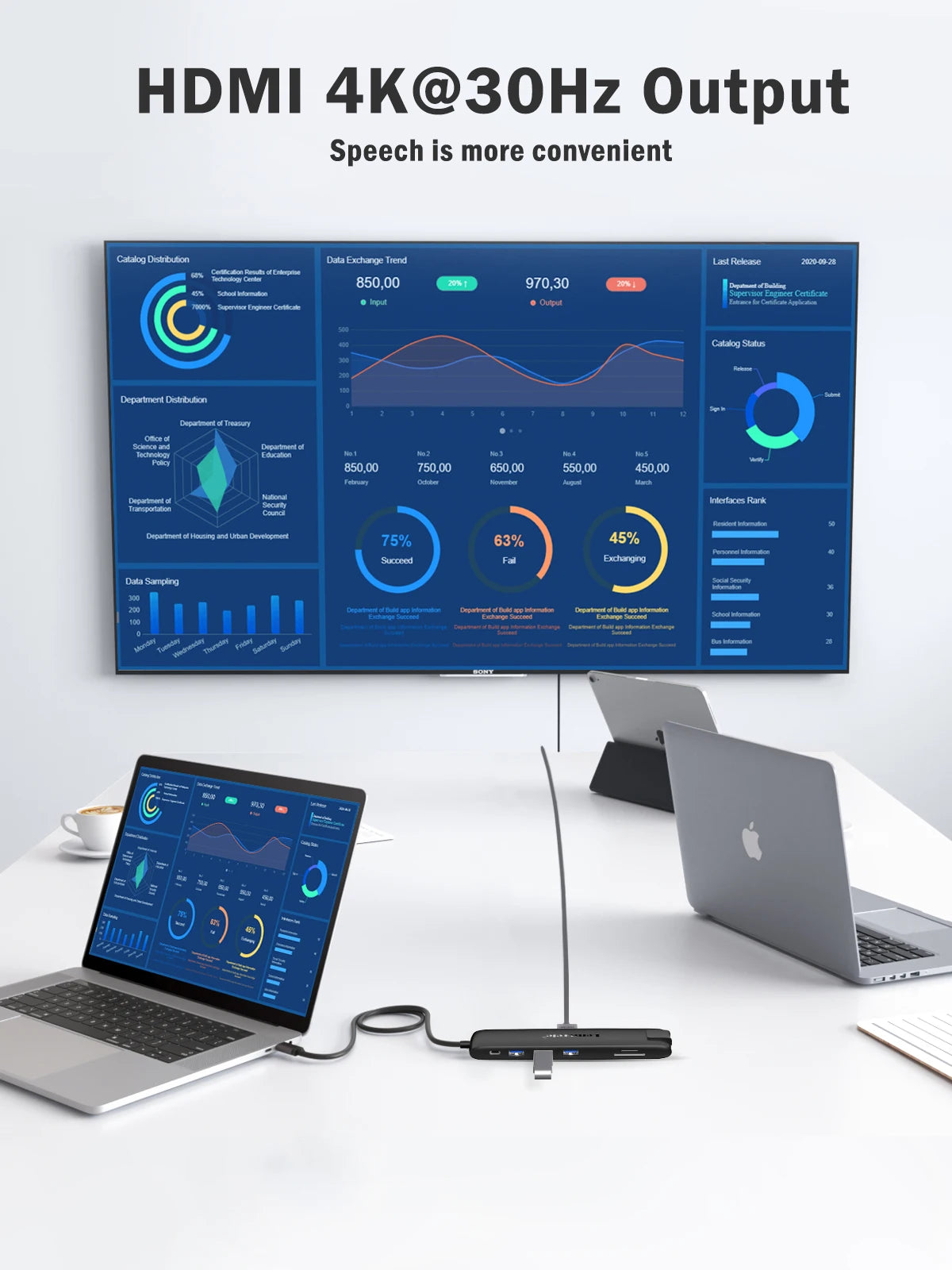 When you use the laptop connection docking station to use the HDMI interface, please make sure that your laptop USB-C port supports audio and video output