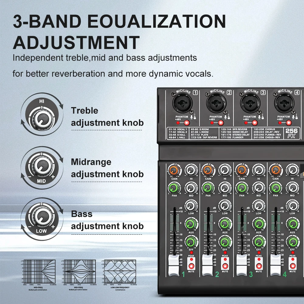 LEUS AU4 Channel 256 DSP Effect Audio Mixer Record PC 48V Phantom Power USB Sound Mixers Bluetooth DJ Console Mixing for Karaok