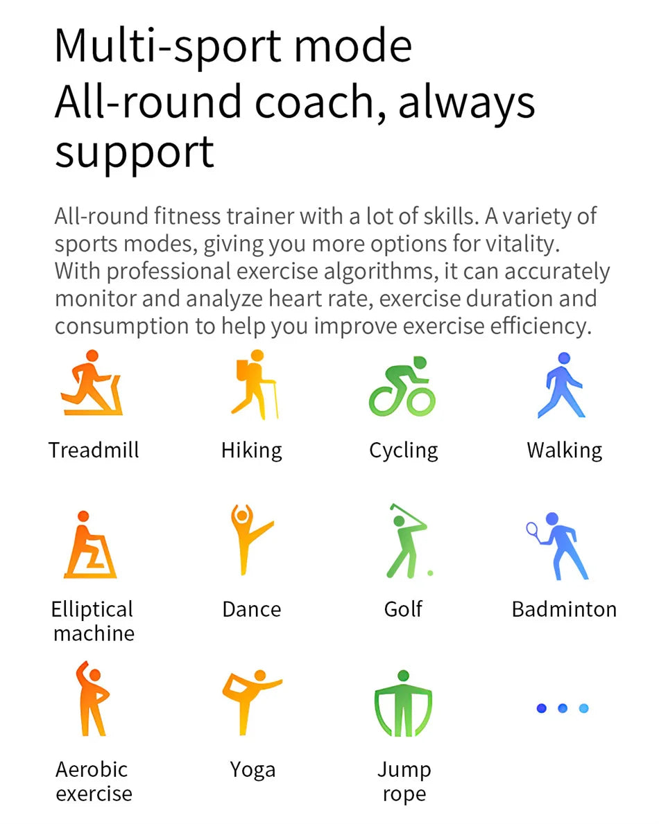 Step counting, exercise mileage, calorie consumption, 22 multi-sport modes, heart rate measurement, blood pressure measurement, blood oxygen measurement, sleep monitoring, breathing training, female physiological cycle, custom alarm clock reminder, drinking water reminder, sedentary reminder, call reminder etc., information push (SMS/QQ/WeChat/Skype/Facebook/Twitter/Line/WhatsApp), weather forecast, find watch, find mobile phone, timer, stopwatch, mobile phone music control, mobile phone camera control, 6 UI styles, flip Wrist bright screen switch, massive dial market, custom dial, time display, bracelet rejection, watch brightness adjustment, do not disturb mode switch, watch language setting, data server storage, support APP to upgrade watch software.