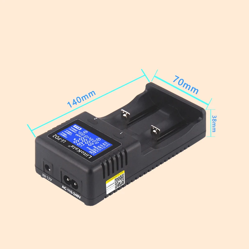 * LCD charging display can display charging percentage, voltage, time, capacity, and battery type Ni-MH 1.2V, Li-Fe 3.2V, Li-ion 3.7V, Li-ion 3.80V (IMR).