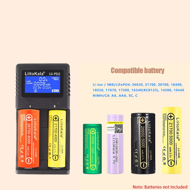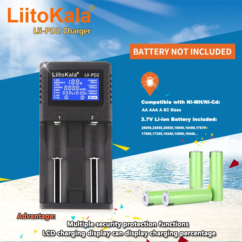 LiitoKala Lii-PD2 18650 Battery Charger for 3.7V Li-ion 18650/18500/16340/26650/21700 /20700/18350/CR123A 1.2V Battery+Car