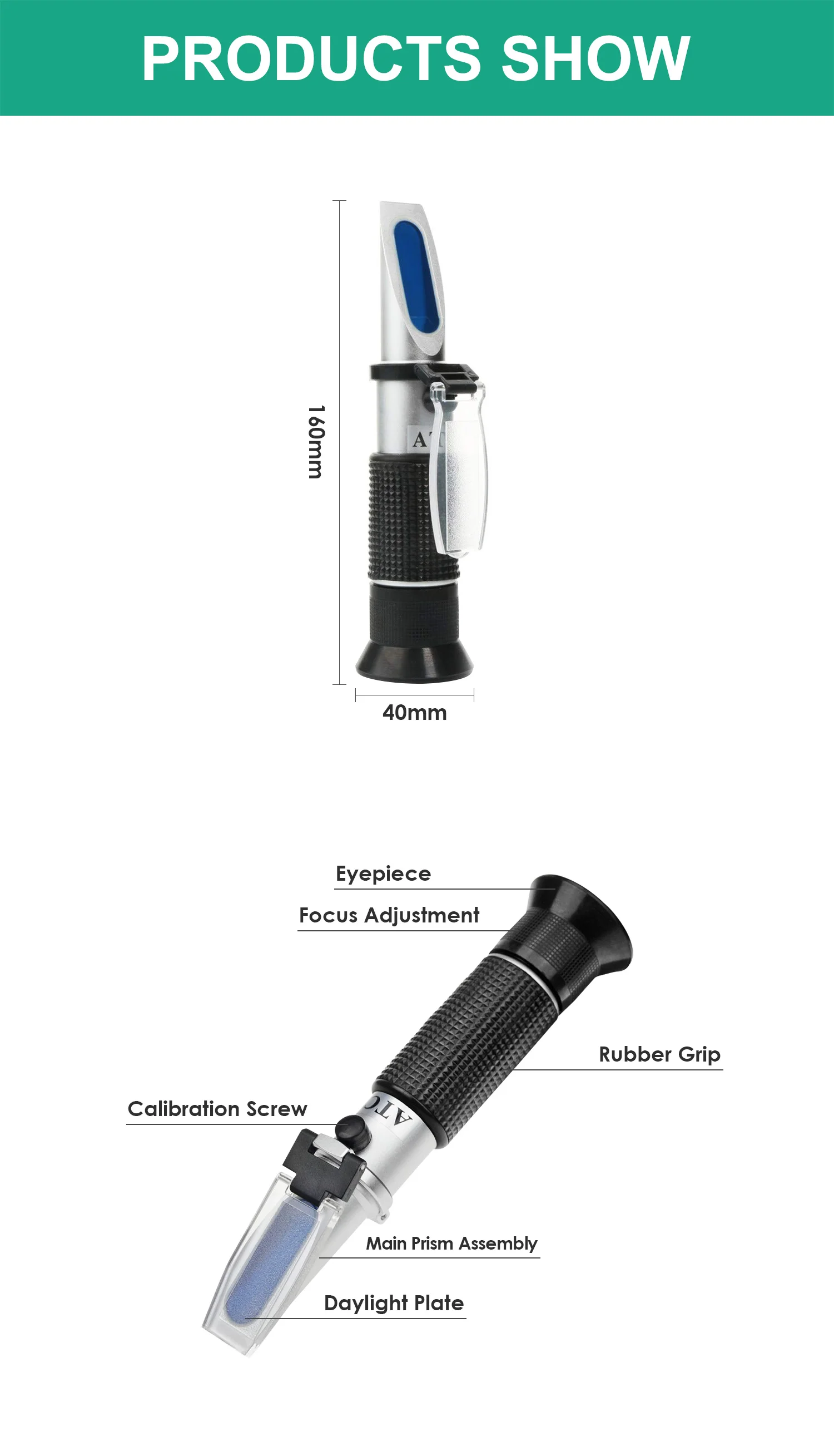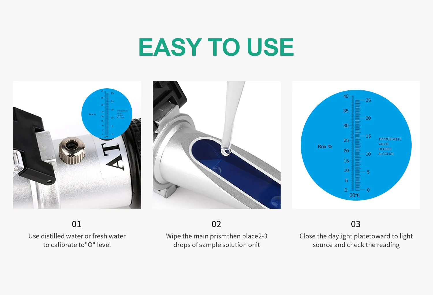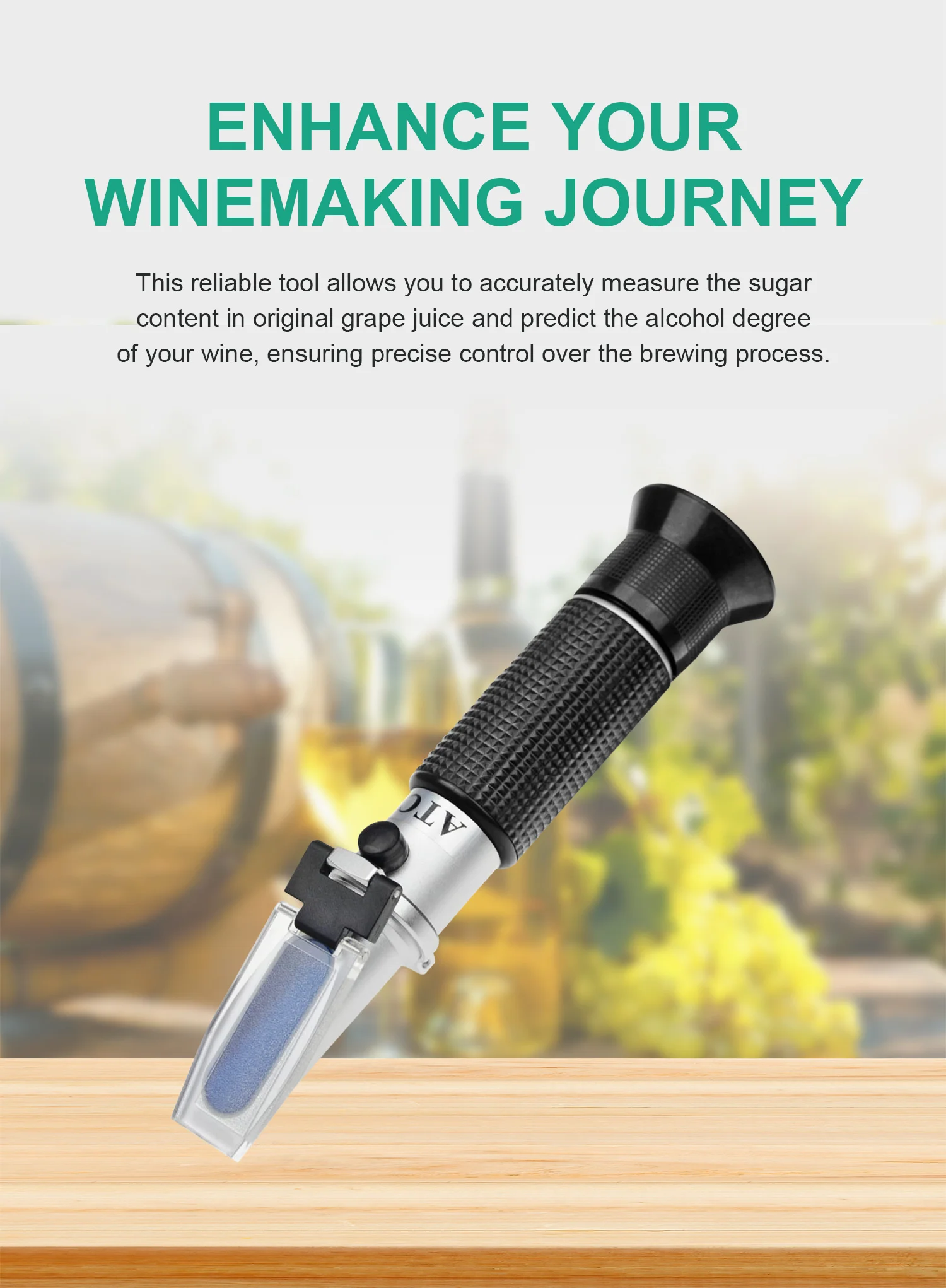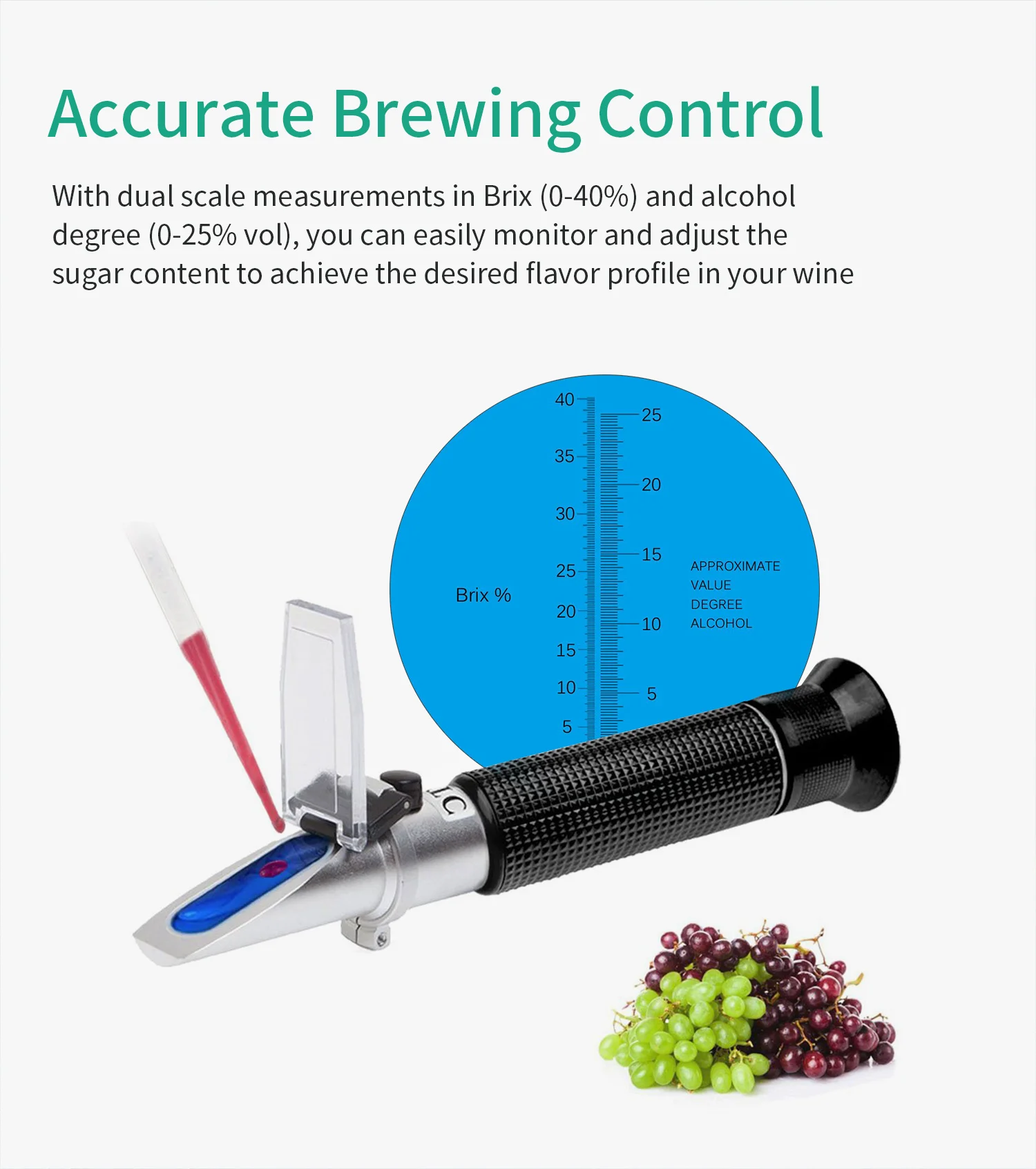 Alcohol & Brix Refractometer is designed for winemaking. Use to test the sugar content and alcohol concentration level by volume in the fermented grapes.
