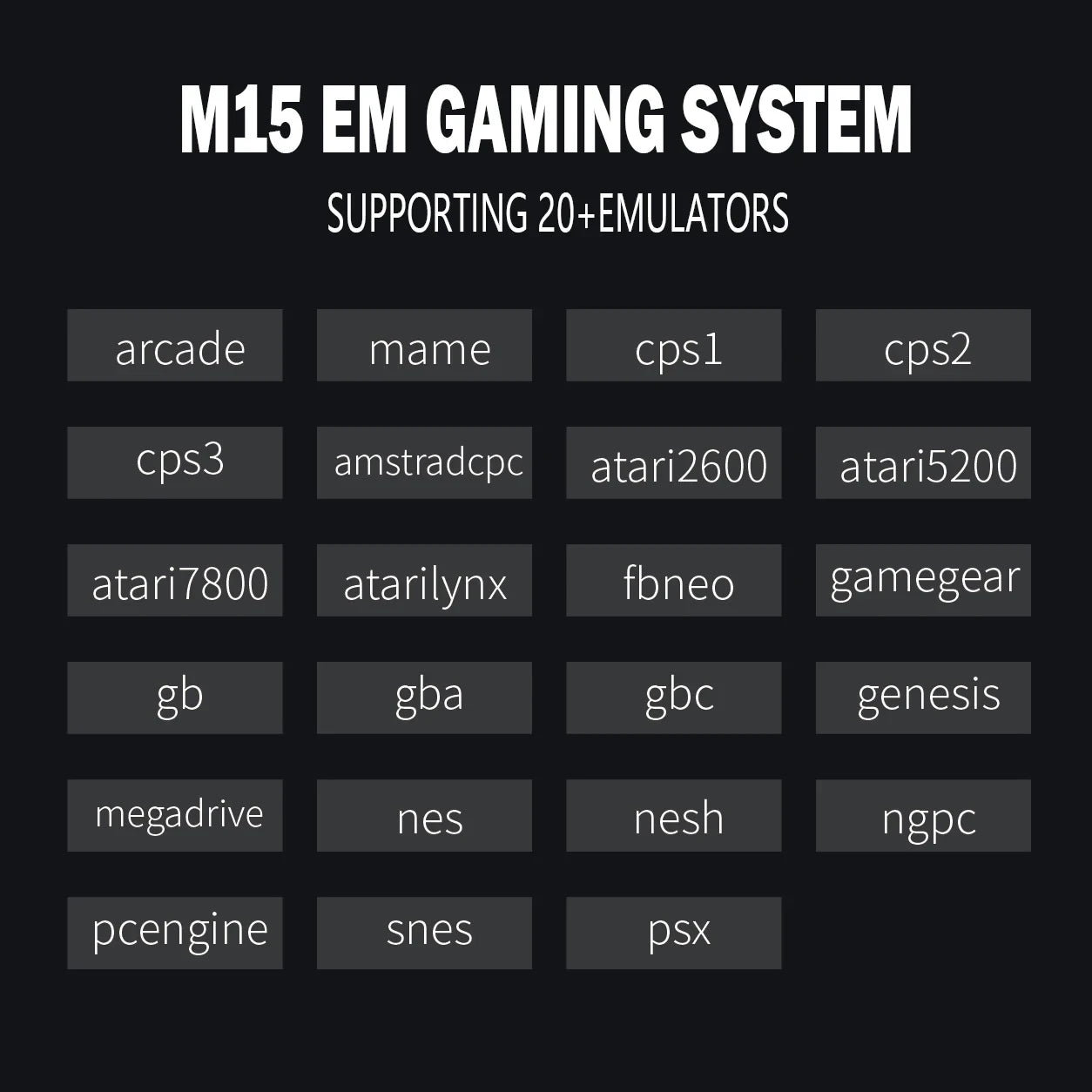 Multiple emulator formats:For ps1/atari/mame/sfc/fc/gba/gb/gbc/md supports emulators. With dual wireless gamepads, the icing on the cake.