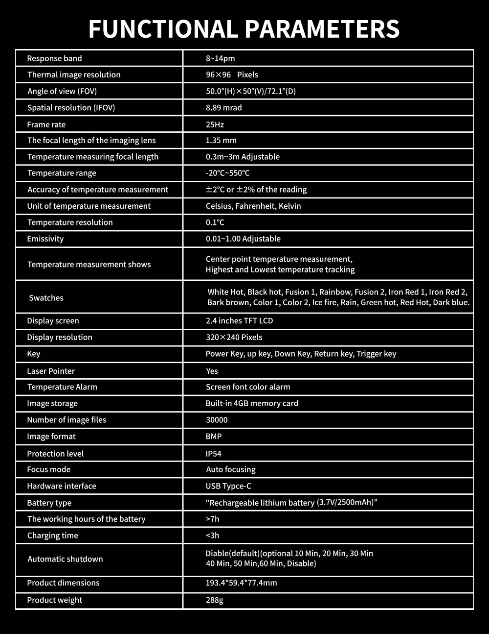 Temperature measuring focal length: 0.3m~3m Adjustable
