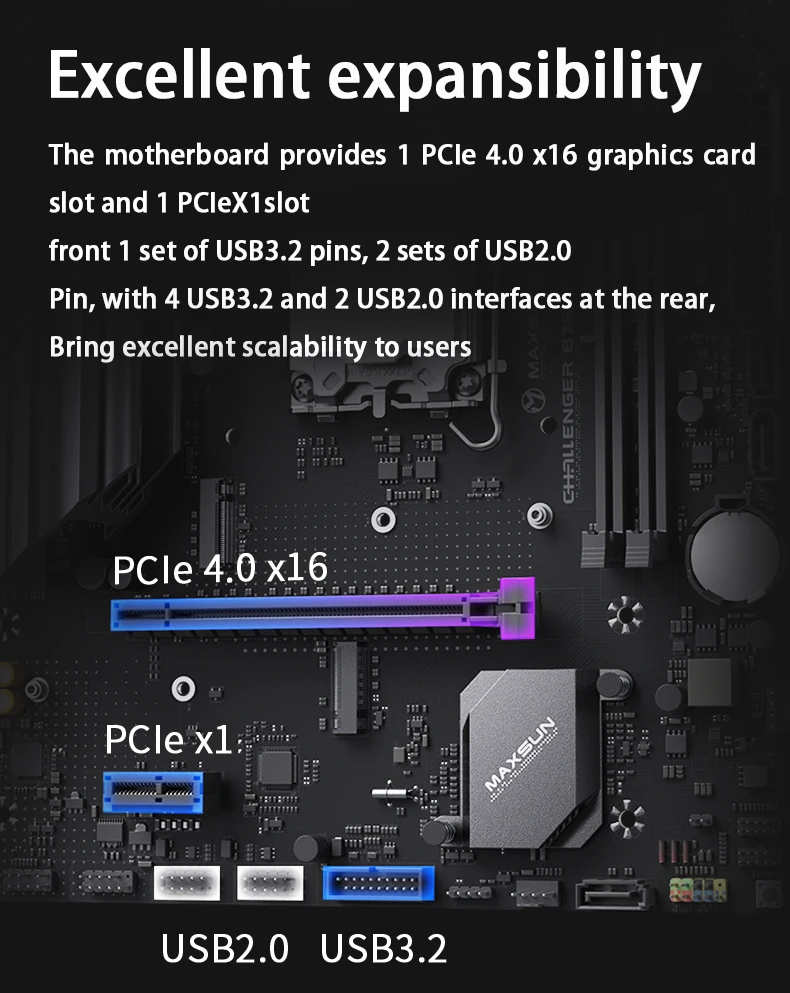 The motherboard provides 1 PCle 4.0 x16 graphics card slot and 1 PCleX1 slot front 1 set of USB3.2 pins, 2 sets of USB2.0 Pin, with 4 USB3.2 and 2 USB2.0 interfaces at the rear, Bring excellent scalability to users