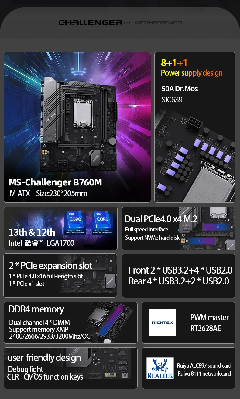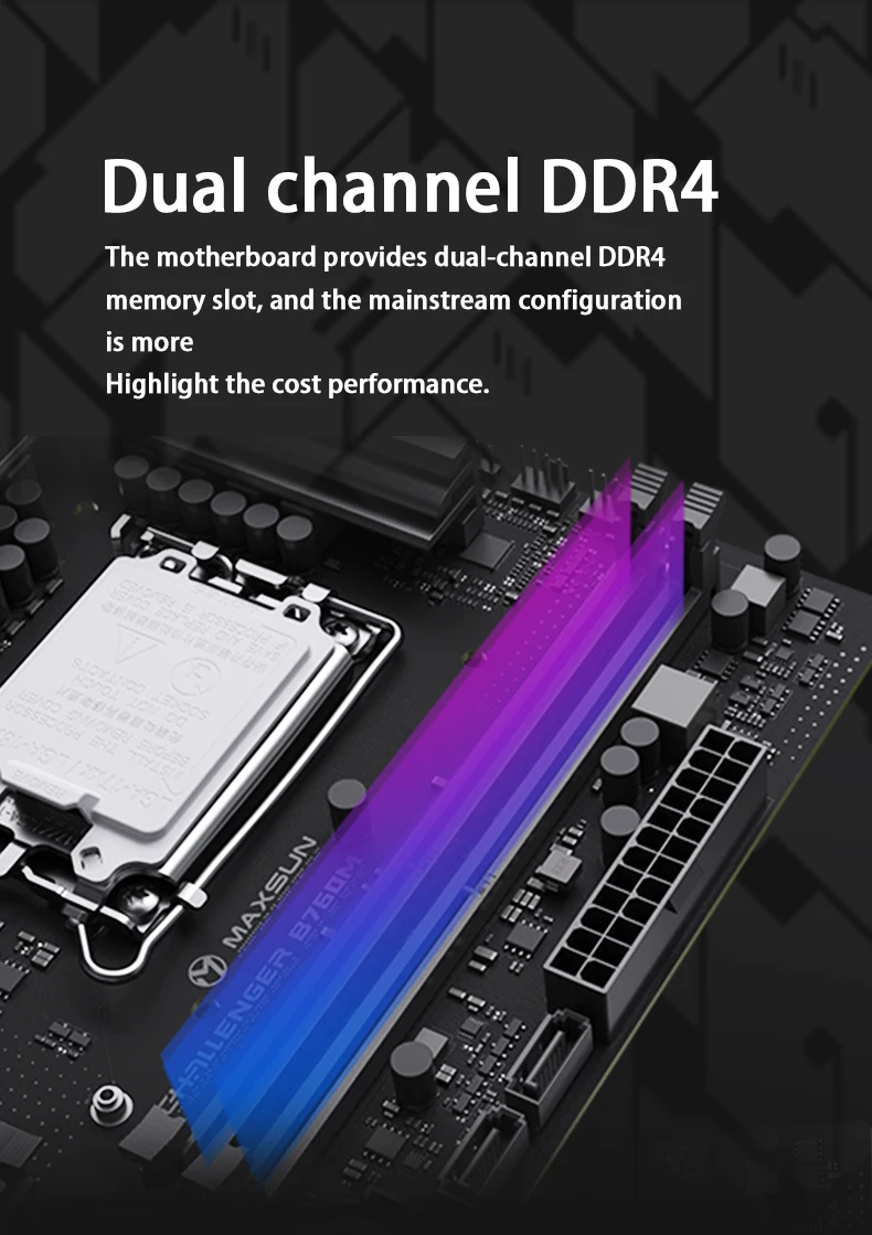• Features DDR4 Memory :Enjoy faster and more efficient data processing with the MAXSUN B760M Motherboard's DDR4 memory.