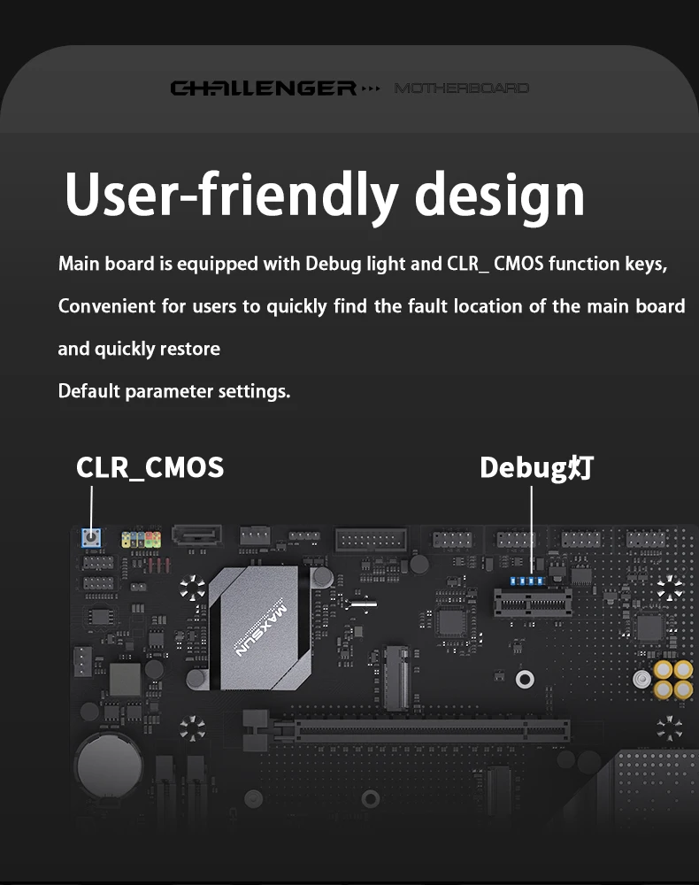 Main board is equipped with Debug light and CLR_ CMOS function keys,Convenient for users to quickly find the fault location of the main board and quickly restore Default parameter settings.