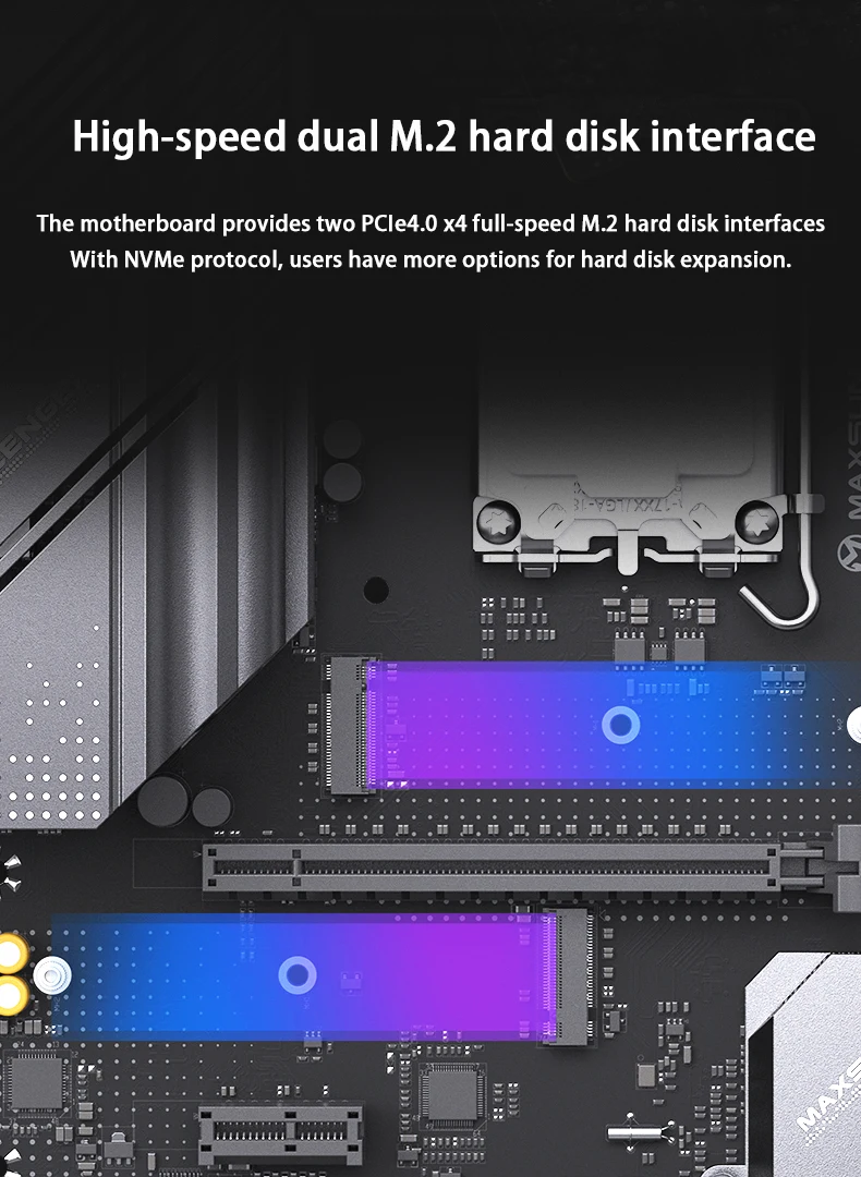 The motherboard provides two PCle4.0 x4 full-speed M.2 hard disk interfaces