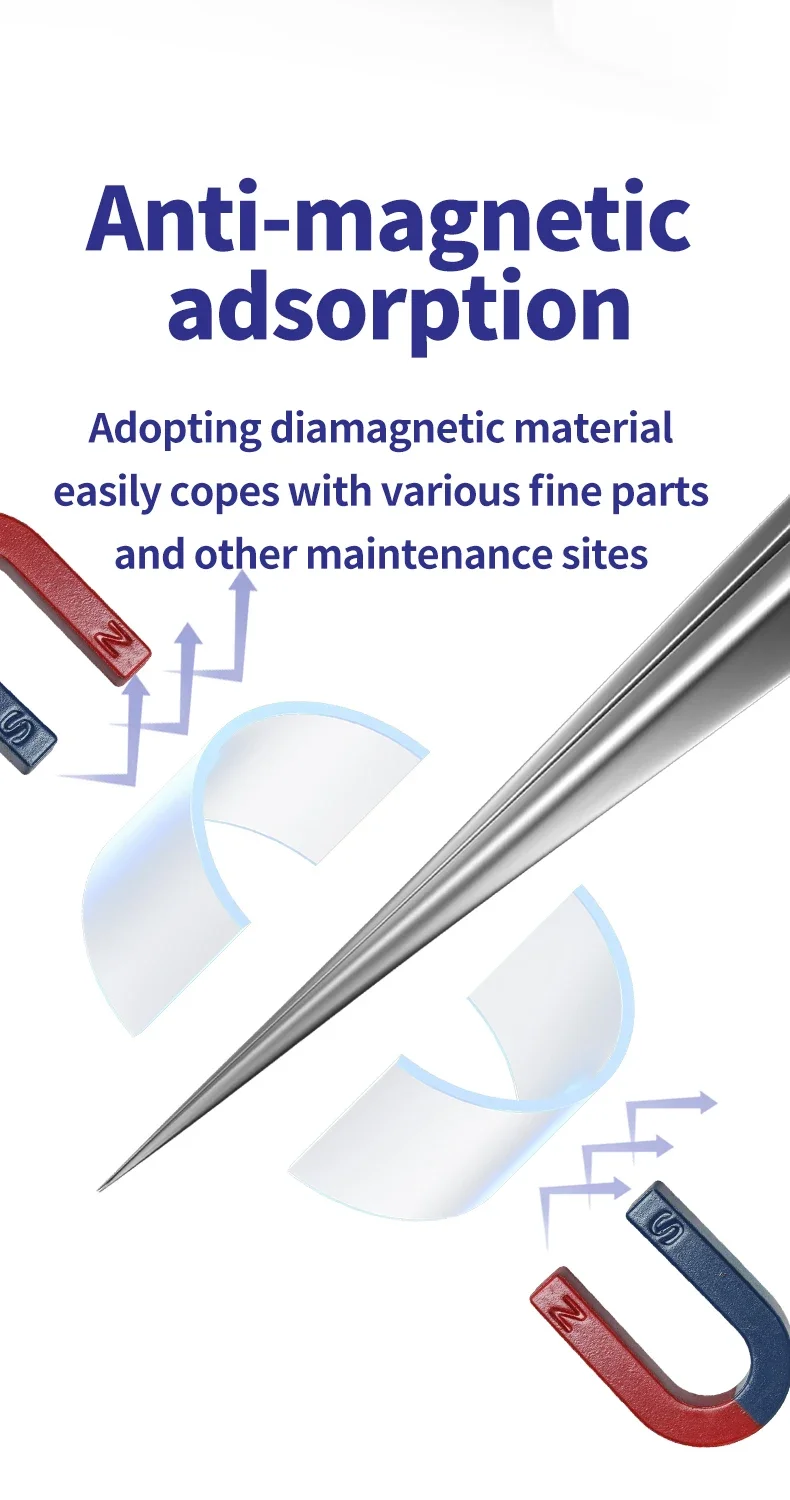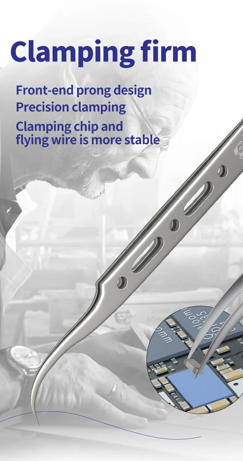 Crafted with anti-magnetic material to prevent adsorption interference. Safely grips delicate chips and flying wires. Features a high-hardness tip for secure holding and an elastic handle for reduced fatigue during prolonged use. Ideal for precision tasks like phone and computer repair.