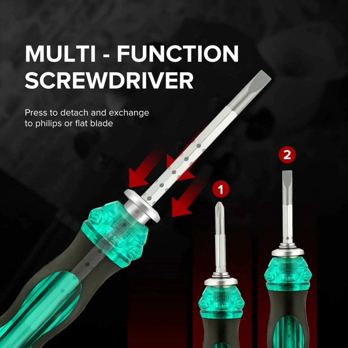 6. Screwdriver: You can adjust the length of the screwdriver and replace the head by pressing the round iron in the middle of the screwdriver.