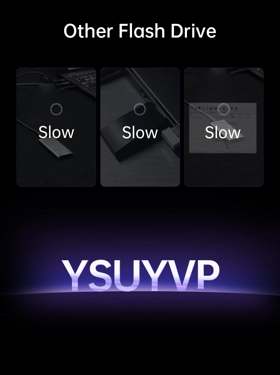 The read and write speed of the USB flash drive is affected by many factors such as computer configuration, interface, file size, etc., and the test environment data of MOVE SPEED product comes from the laboratory. If you use a device below the test environment configuration to transfer files, or copy more file documents or pictures, the actual transfer speed will be lower than the nominal speed in various degrees. The transfer speed of solid-state products such as solid-state USB flash drive/SSD is affected by Flash particles, so solid-state products are generally made with an SLC buffer via firmware. The speed of a single copy of a file that is less than or equal to the SLC cache set capacity is very fast. SLC buffer generally only accounts for 20% of the total capacity. Such as 1TB products, SLC buffer is generally less than 200GB, and the speed of a single copy of the file within 200GB is very fast. When a single copy exceeds this capacity, the later speed may slow down. The above is the result of Flash characteristics. It is normal that the speed may decrease when the capacity of a single copy exceeds the cache capacity and you copy small and fragmented files.
