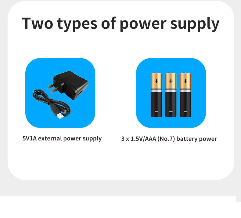 Power supply method: 3 1.5V AAA batteries / 5V/1A external power supply