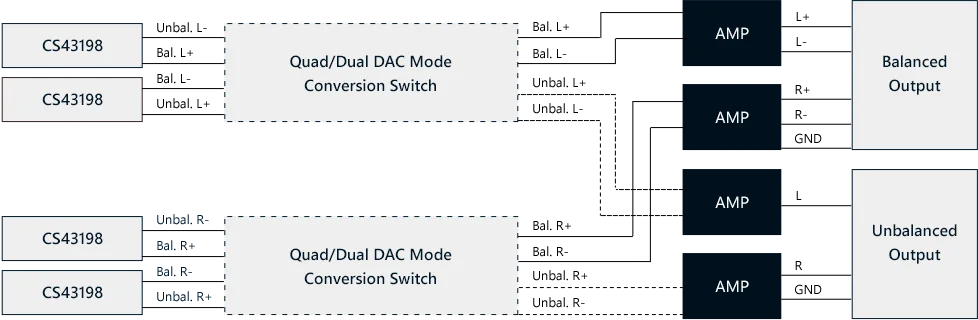 A Dual/Quad DAC Switching mode is offered enabling users to adjust and improve power management efficiency, further improving the long continuous playtime, a core feature of the A&norma series.