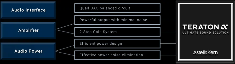 TERATON ALPHA, engineered through endless research, is Astell&Kern's unique technology that has been designed to produce audio playback that is as close to the original sound through effective power noise removal, efficient power management and unwavering amplification, and a fully converted audio output interface.
