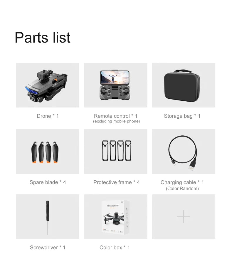 Up/Down/Front/Rear/Left/Right Turn, Lateral Flight, LED Lights, Headless Mode, One Key Auto Return, Height Hold Mode, WiFi FPV (Dual Lens with Dual Lens Switching Function)