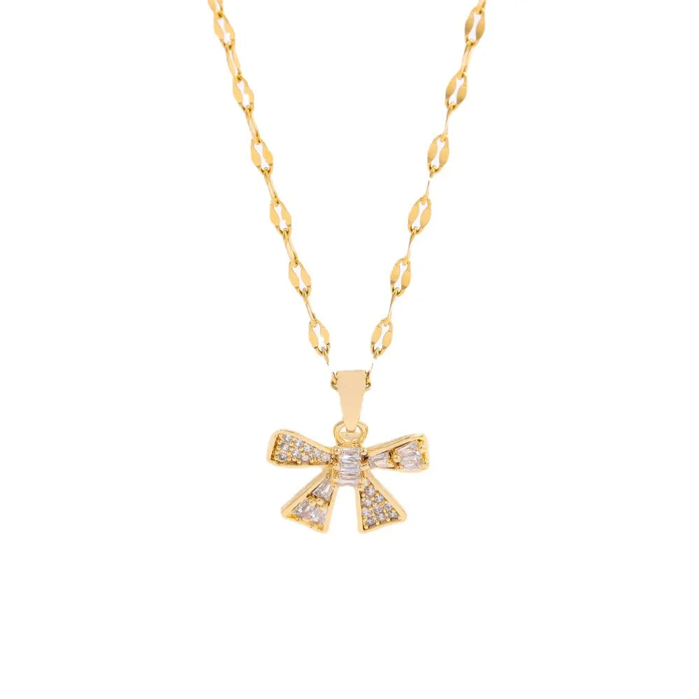 New Fashion Sweet Zircon Crystal Bowknot Pendant Necklaces For Women Temperament Gold Color Stainless Steel Neck Chain Jewelry