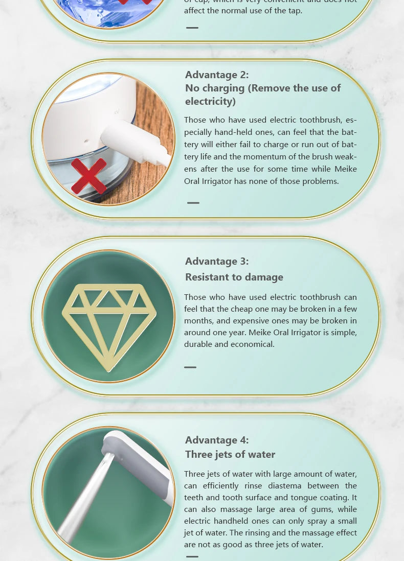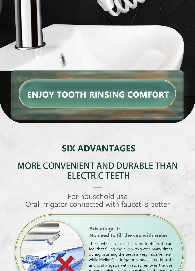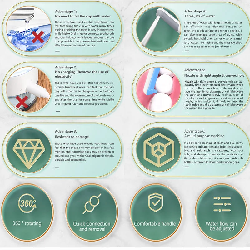 No need to fill the cup with water Those who have used electric toothbrush can feel that filling the cup with water many times during brushing the teeth is very inconvenient while Meike Oral lrrigator connects toothbrush and oral irrigator with faucet removes the use of cup, which is very convenient and does not affect the normal use of the tap.