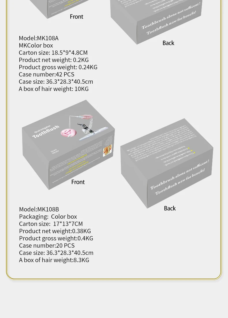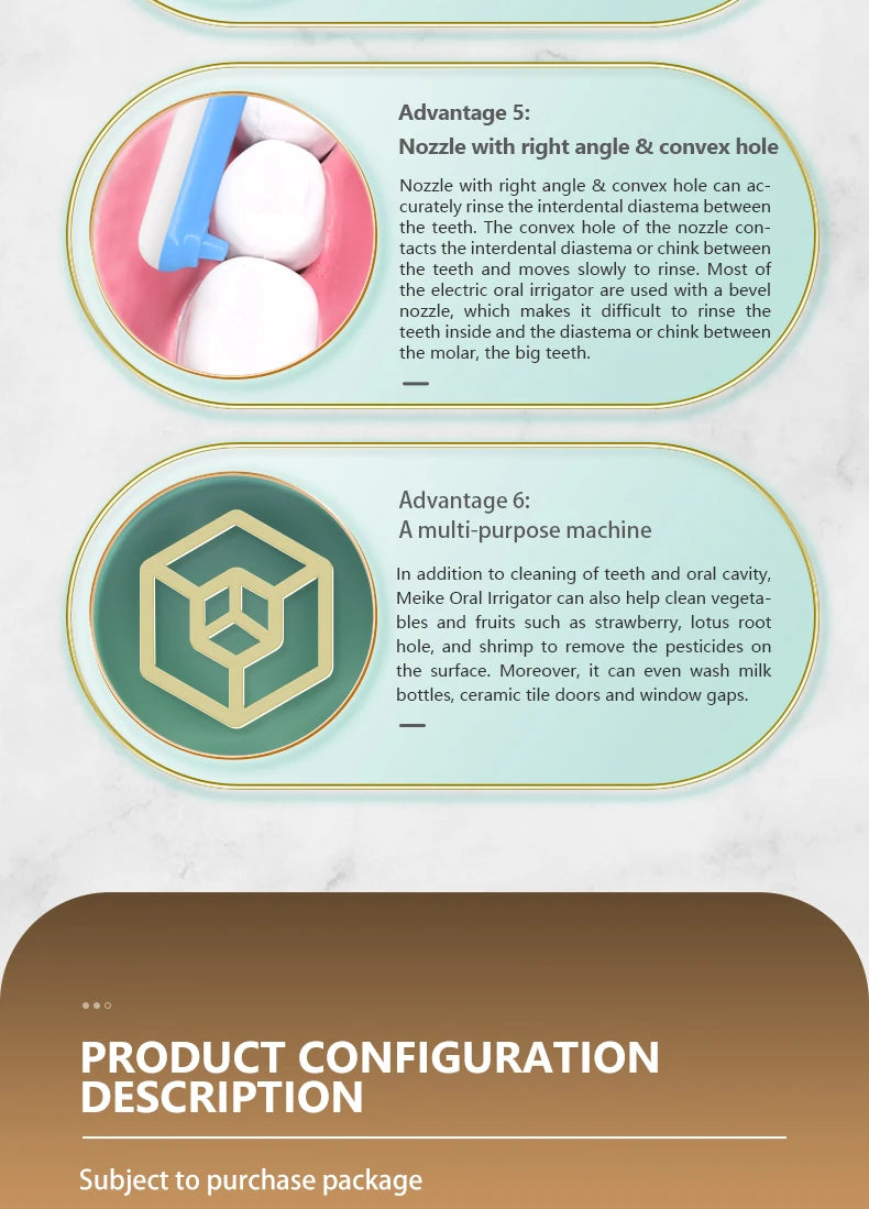 No charging (Remove the use ofelectricity) Those who have used electric toothbrush. es pecially hand-held ones, can feel that the bat tery will either fail to charge or run out of bat tery life and the momentum of the brush weak ens after the use for some time while Meike Oral lrrigator has none of those problems.