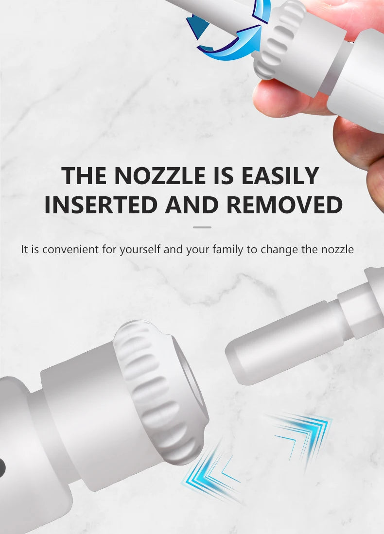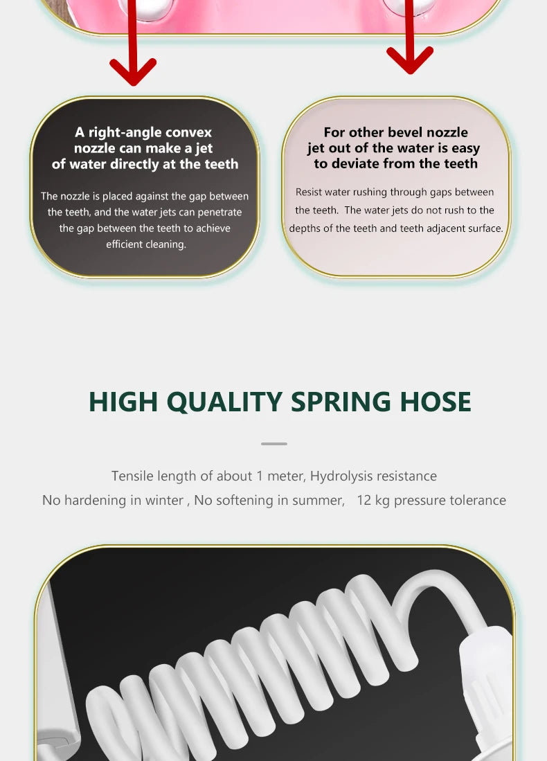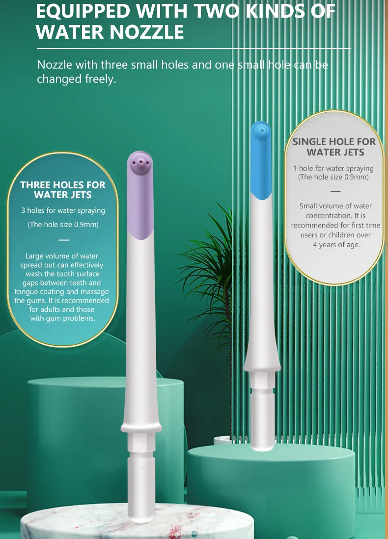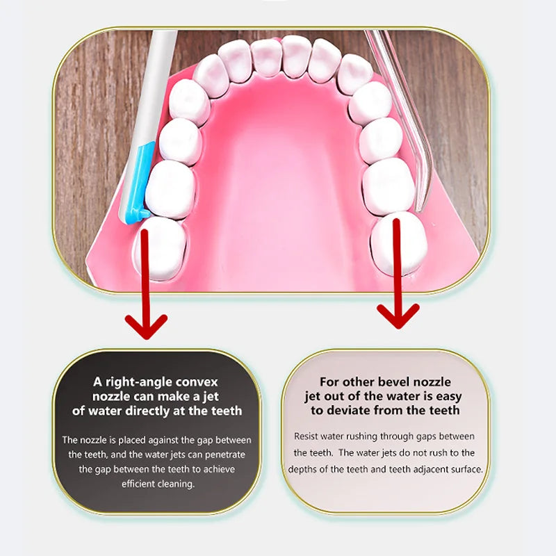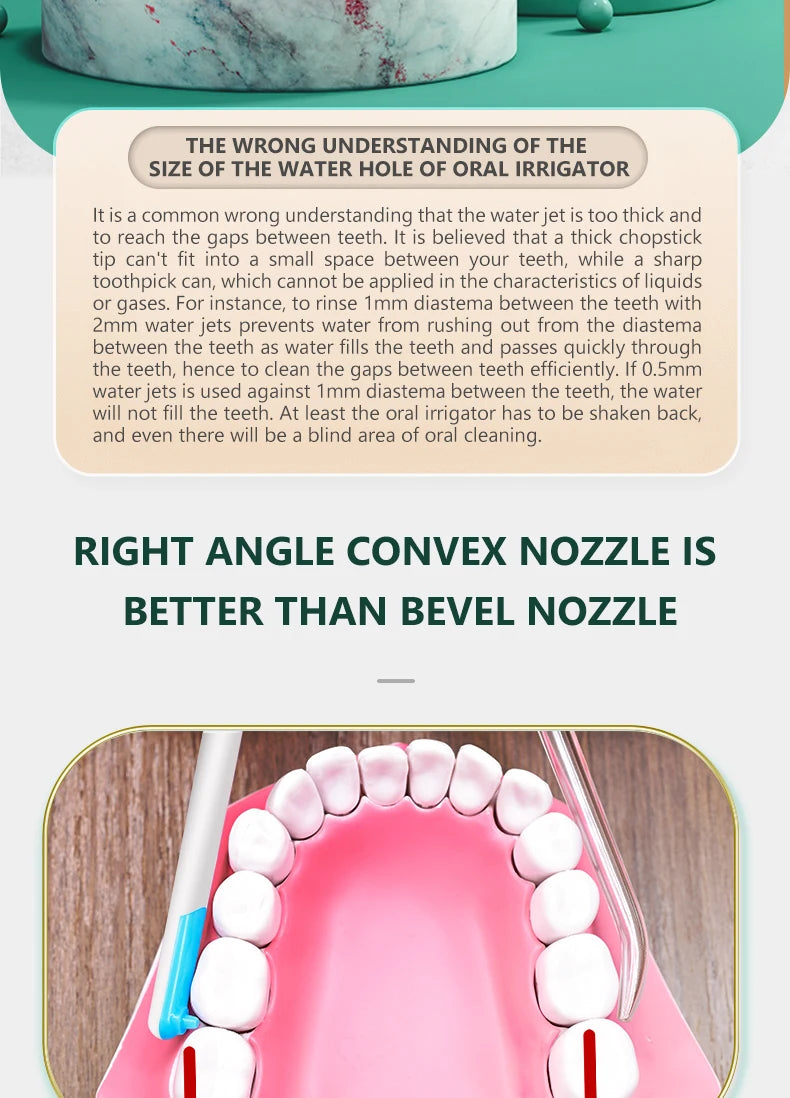 Nozzle with right angle & convex hole can ac curately rinse the interdental diastema between the teeth. The convex hole of the nozzle con tacts the interdental diastema or chink between the teeth and moves slowly to rinse. Most of the electric oral irrigator are used with a beve nozzle, which makes it difficult to rinse the teeth inside and the diastema or chink between the molar, the big teeth
