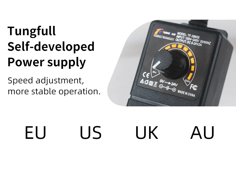 ✨ Adjustable speed power supply, more powerful: Tungfull self-developed power supply, the current can reach 24V 2A.