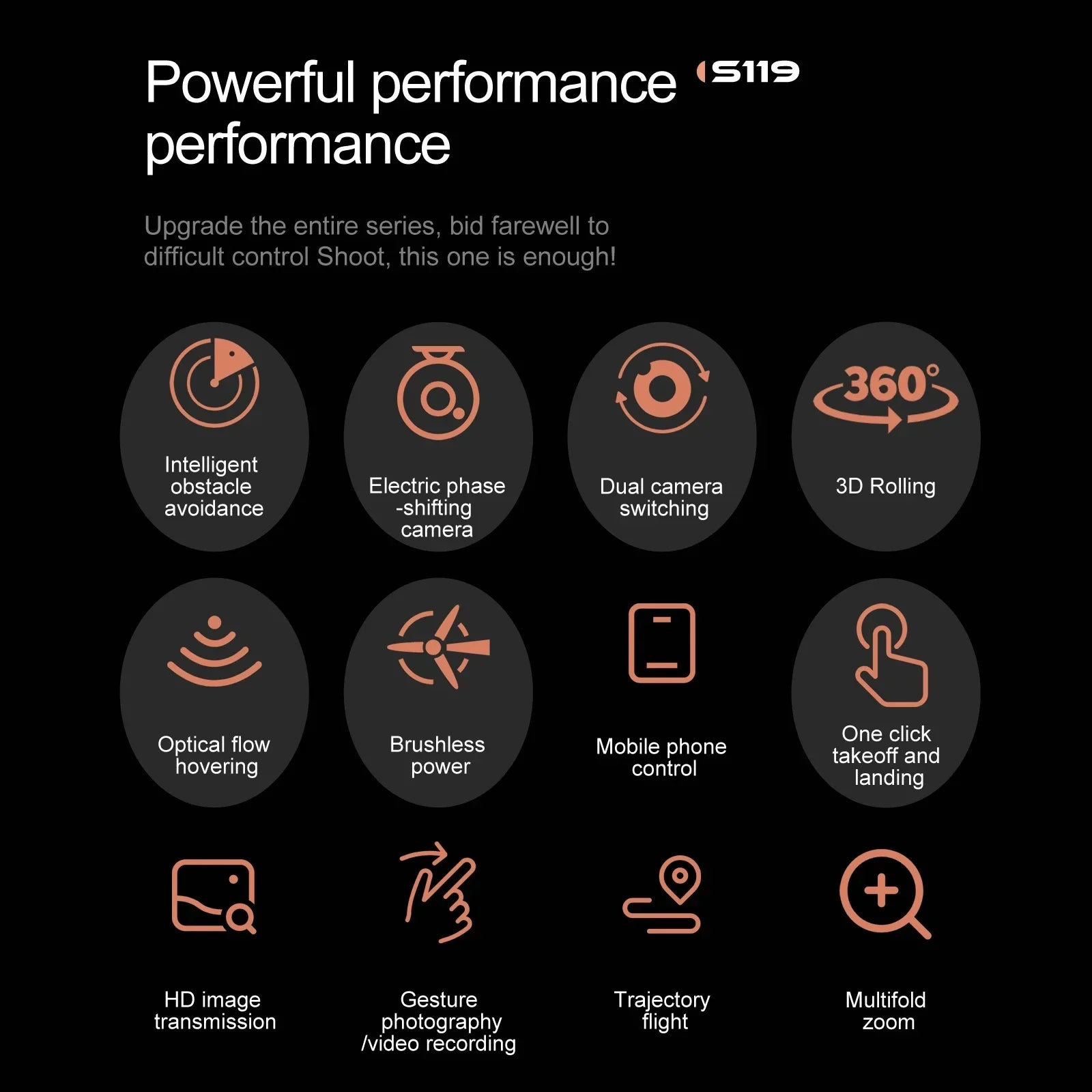 Brushless Motor Strong Powerful,Infrared 4-Sided Obstacle Avoidance,Optical Flow,ESC HD Camera,Forward,Backward,Left turn,Right turn,Up,Down,Side Fly,One Key Take-Off,One Key Landing,Headless Mode,Speed Adjustable,Wi-Fi Transmission,50 Times Zoom,Gesture Photography,Gesture MV Shooting,Motion Sensor,Track Flight