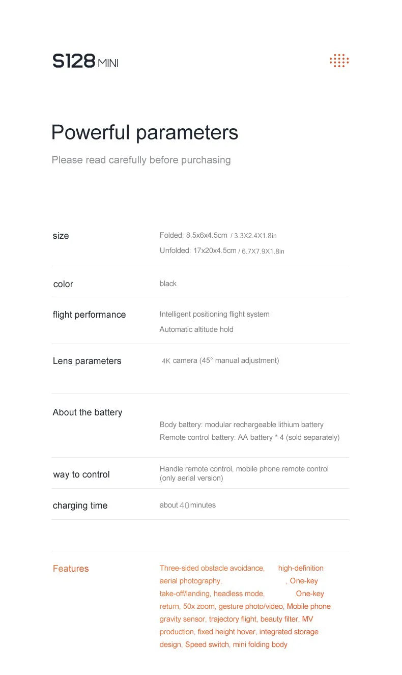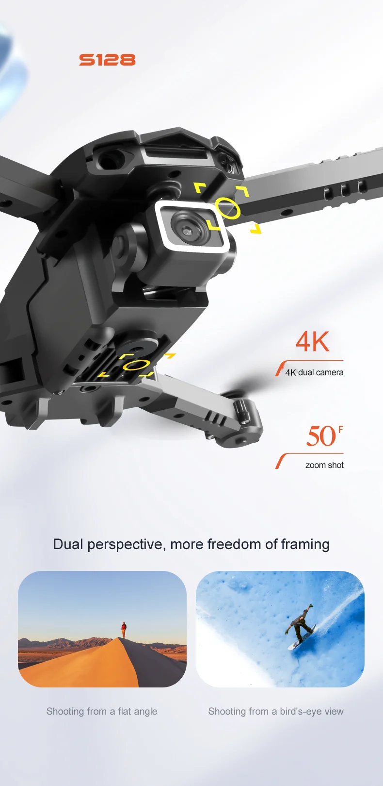 • 4K UHD Camera :Capture stunning visuals with the S128 Mini Drone's 4K UHD camera, perfect for both indoor and outdoor use.
