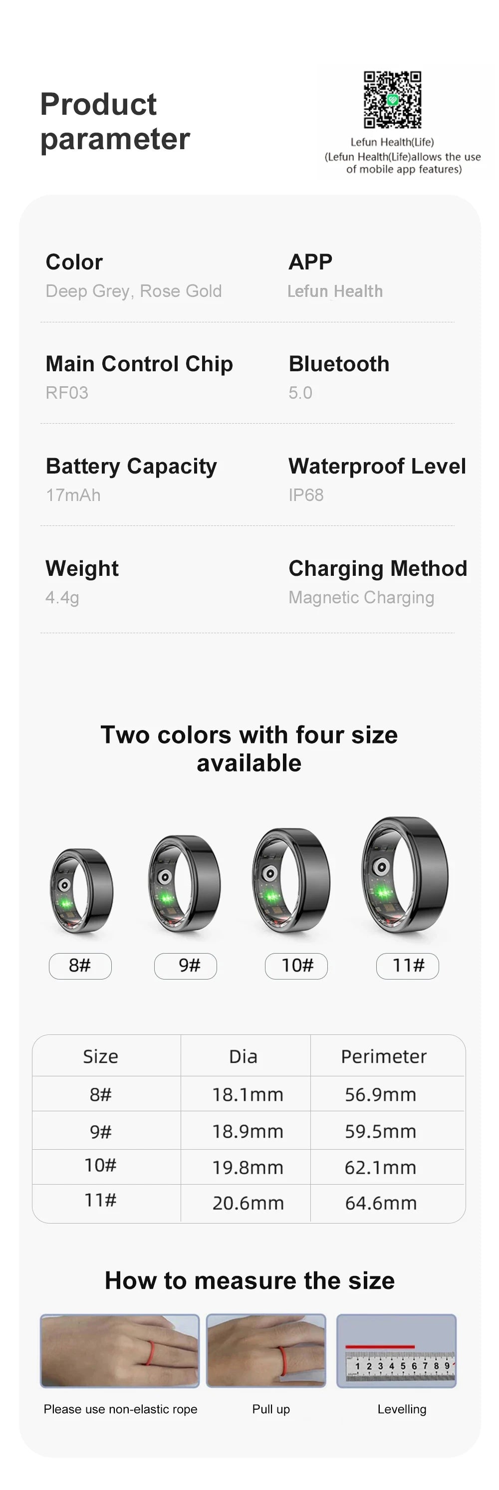 • Titanium Steel Shell :The LEMFO LT01 Smart Ring is designed with a robust titanium steel shell, ensuring durability and longevity of the device.