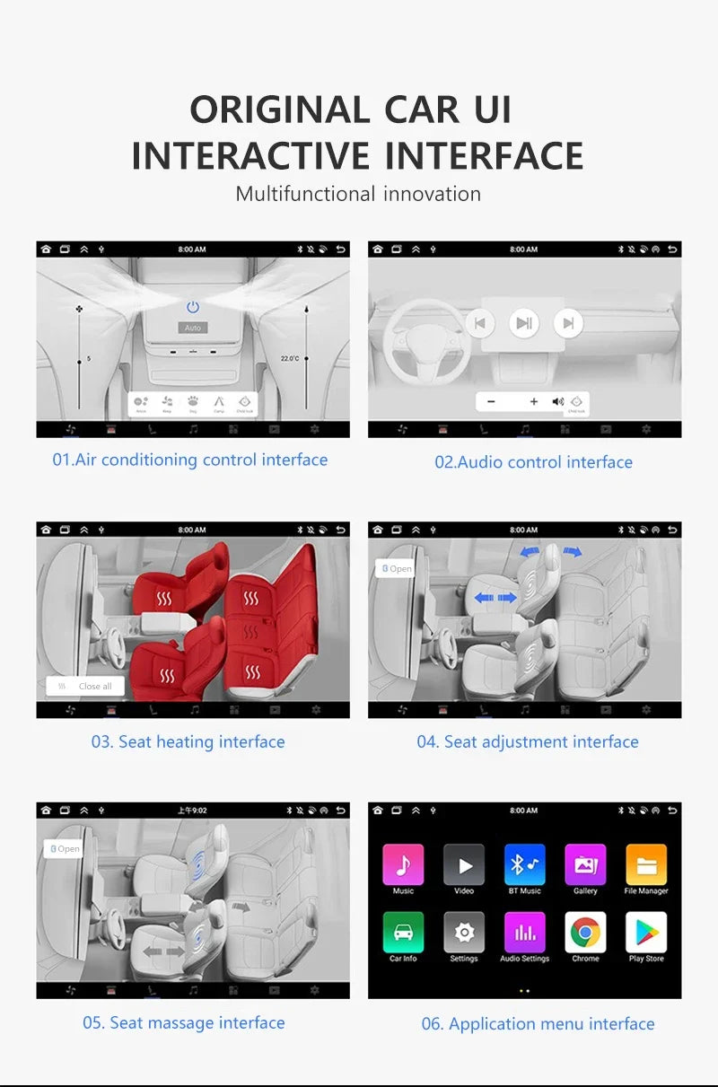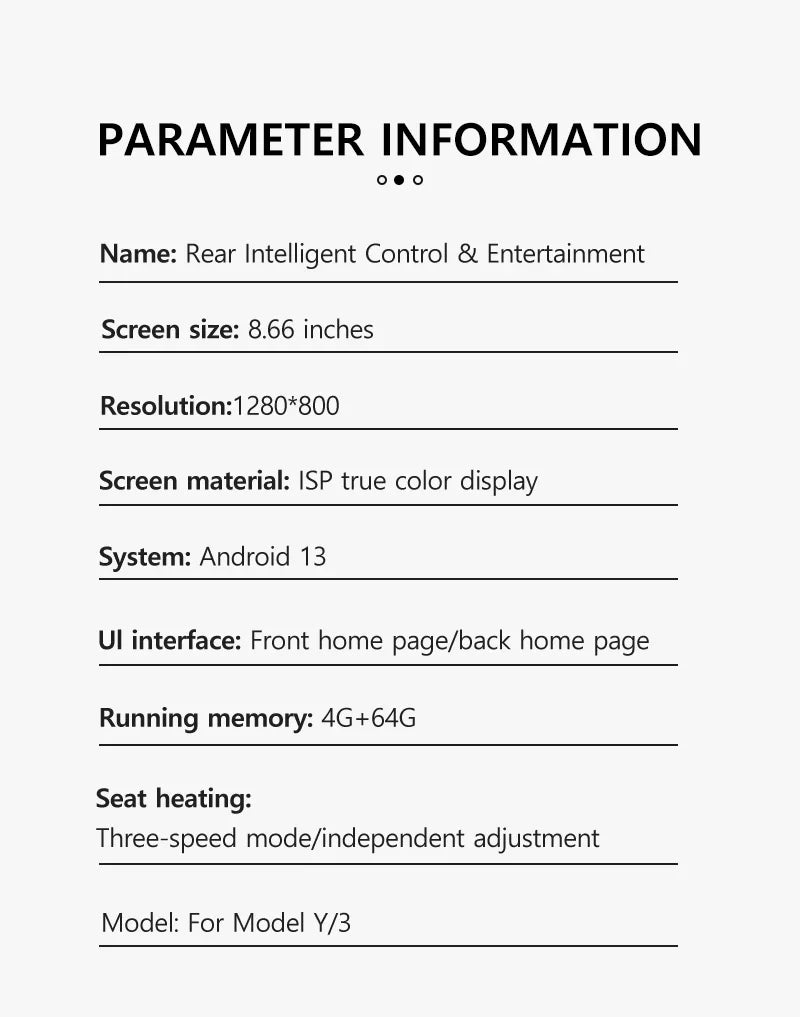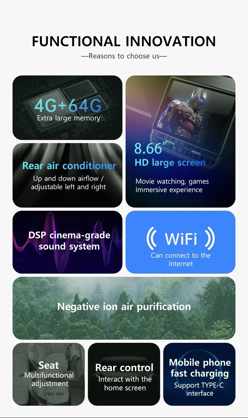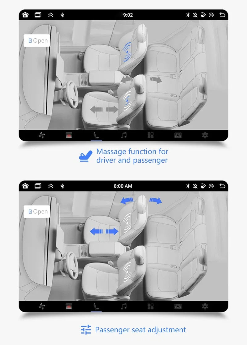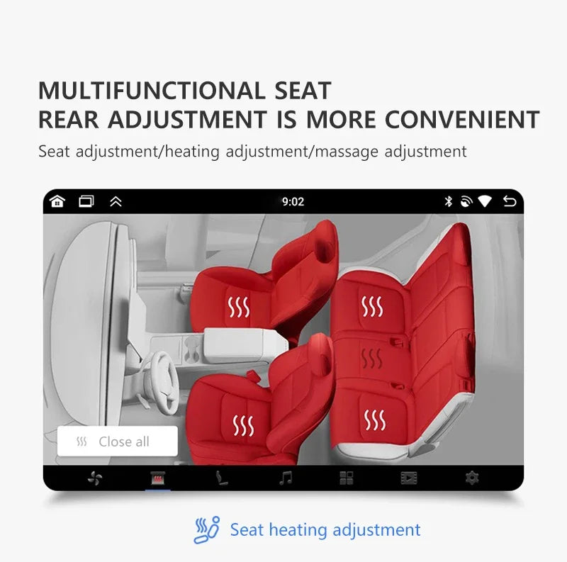【Diverse functions 】the rear display panel supports front passenger seat and backrest (front/rear) adjustment, independent rear seat heating adjustment, air conditioning climate control, and wind speed adjustment.