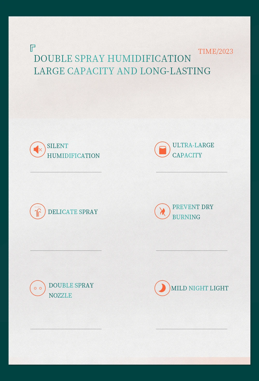 • Double Jet Humidifier :The double jet design ensures even distribution of moisture, providing a more comfortable and healthy environment.