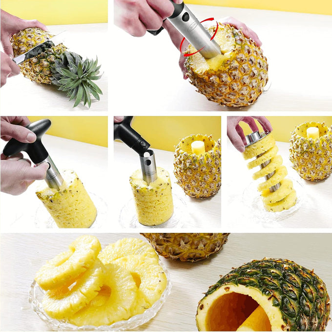 - Easy to use, Peels, cores, and slices an entire pineapple in seconds.