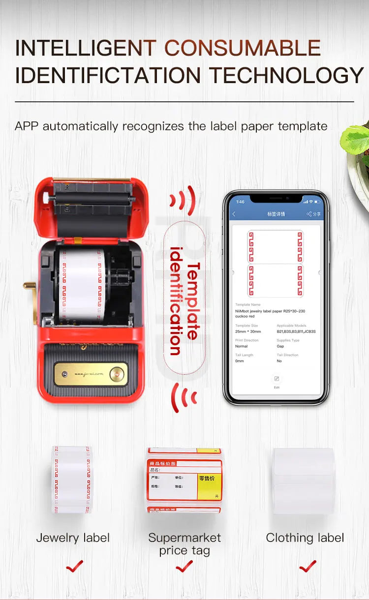 Don’t need to buy toner, or carbon tape anymore! NIIMBOT wireless label maker printer with tape, 1.96*1.18 inch (50*30 mm). B21 label printer support label width 0.8''-2''. Label maker machine size: 5.1*3.7*2.4 inch(13*9.4*6 cm). Weight: 0.66lb.